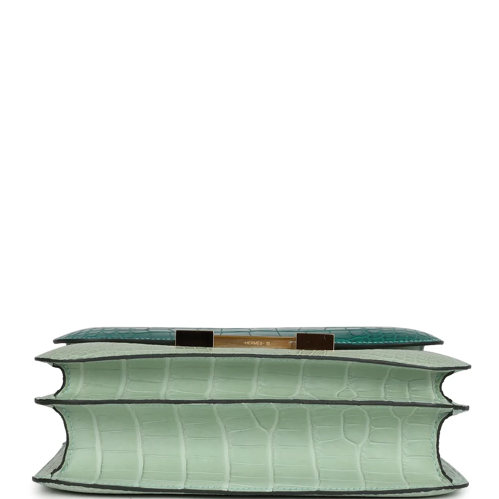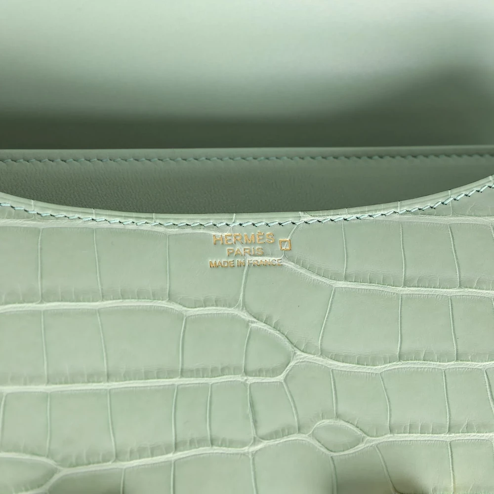 This Hermès Constance 24 in Bicolor Vert D’eau and Malachite is an artistic fusion of elegance. The combination of soft and deep green shades creates a bold visual contrast. Matte alligator leather enhances its structured and luxurious feel. Gold hardware adds a regal and sophisticated touch. Spacious yet stylish, making it a statement collector’s piece. Elevate your collection with this rare and stunning Constance.