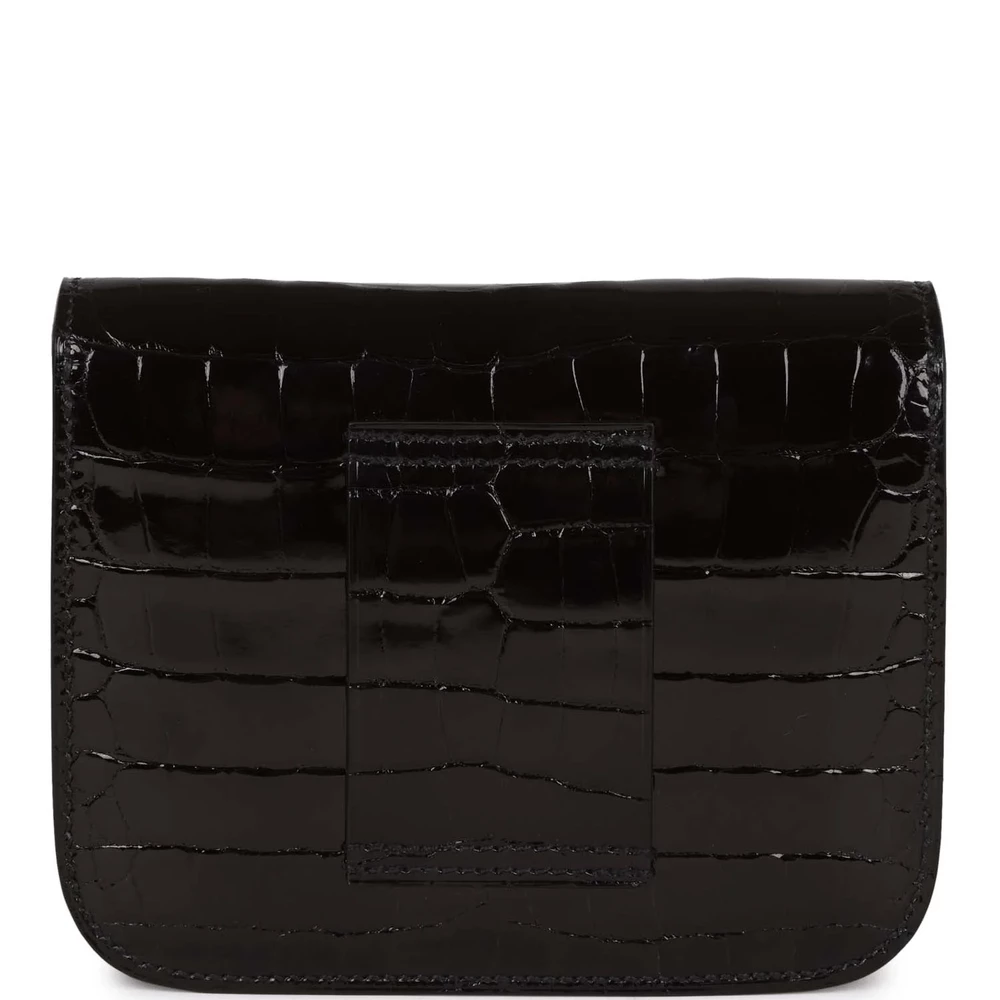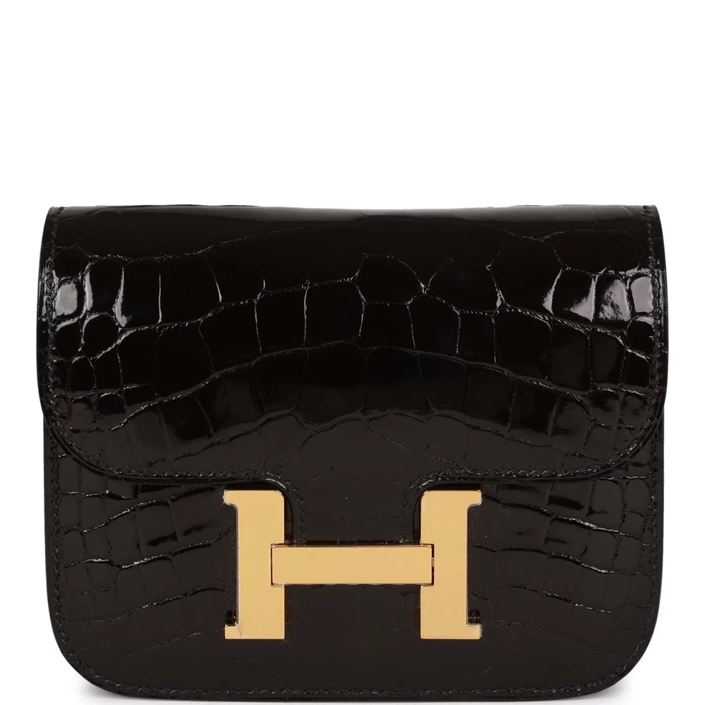 This Hermès Constance Slim Wallet in Shiny Black Alligator leather is a luxurious and striking piece, accented by gold hardware. Its glossy finish and classic black hue make it a standout accessory for any occasion. Perfect for those who appreciate bold yet timeless pieces, it is a true reflection of Hermès’ craftsmanship and sophistication.