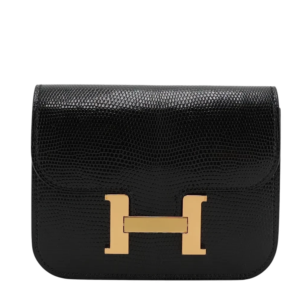This Hermès Constance Slim Wallet is a luxurious and elegant piece, crafted from exquisite lizard leather in classic Black (89). The rich texture of the material is beautifully complemented by radiant gold hardware, creating a striking contrast that enhances its timeless appeal. Stamped with a “U” for 2022, this wallet embodies the impeccable craftsmanship and refinement synonymous with Hermès. Designed for both style and functionality, it measures approximately 13cm in width, 10cm in height, and 2cm in depth, offering a sleek yet practical silhouette. Accompanied by its original box, dustbag, and felt, this exceptional piece is available in Singapore, making it a coveted addition to any luxury collection.