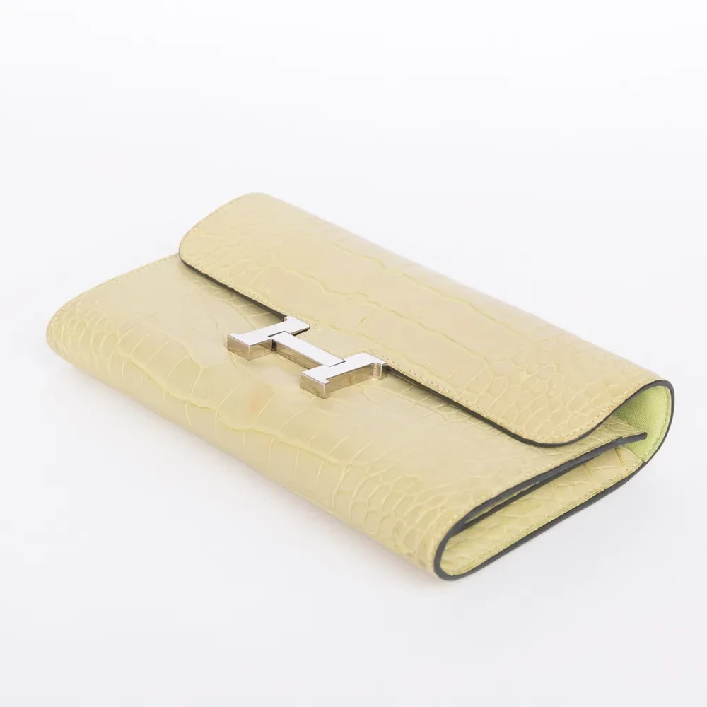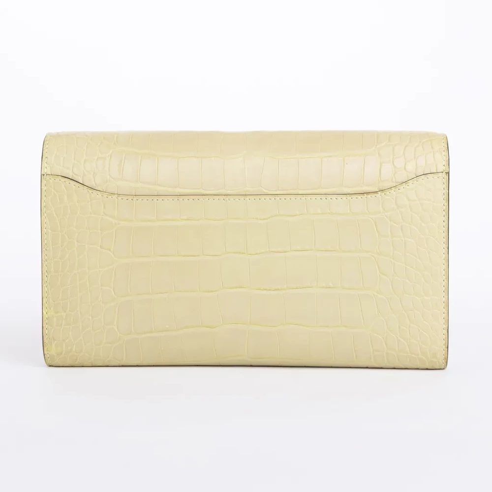 This Hermès Constance To Go long wallet is a statement of luxury and sophistication, crafted from exquisite matte alligator leather in the vibrant Jaune Bourgeon (R9) shade. The striking yellow hue is beautifully complemented by sleek palladium hardware, creating a refined yet bold aesthetic. Stamped with a “Z” for 2021, this piece exemplifies Hermès’ dedication to superior craftsmanship and timeless design. With dimensions of approximately 20.5cm in width and 11.5cm in height, it offers both style and functionality, while the detachable 122cm shoulder strap provides versatile carrying options. Accompanied by its original shoulder strap, this exceptional wallet is available in Japan, making it a highly desirable addition to any luxury collection.