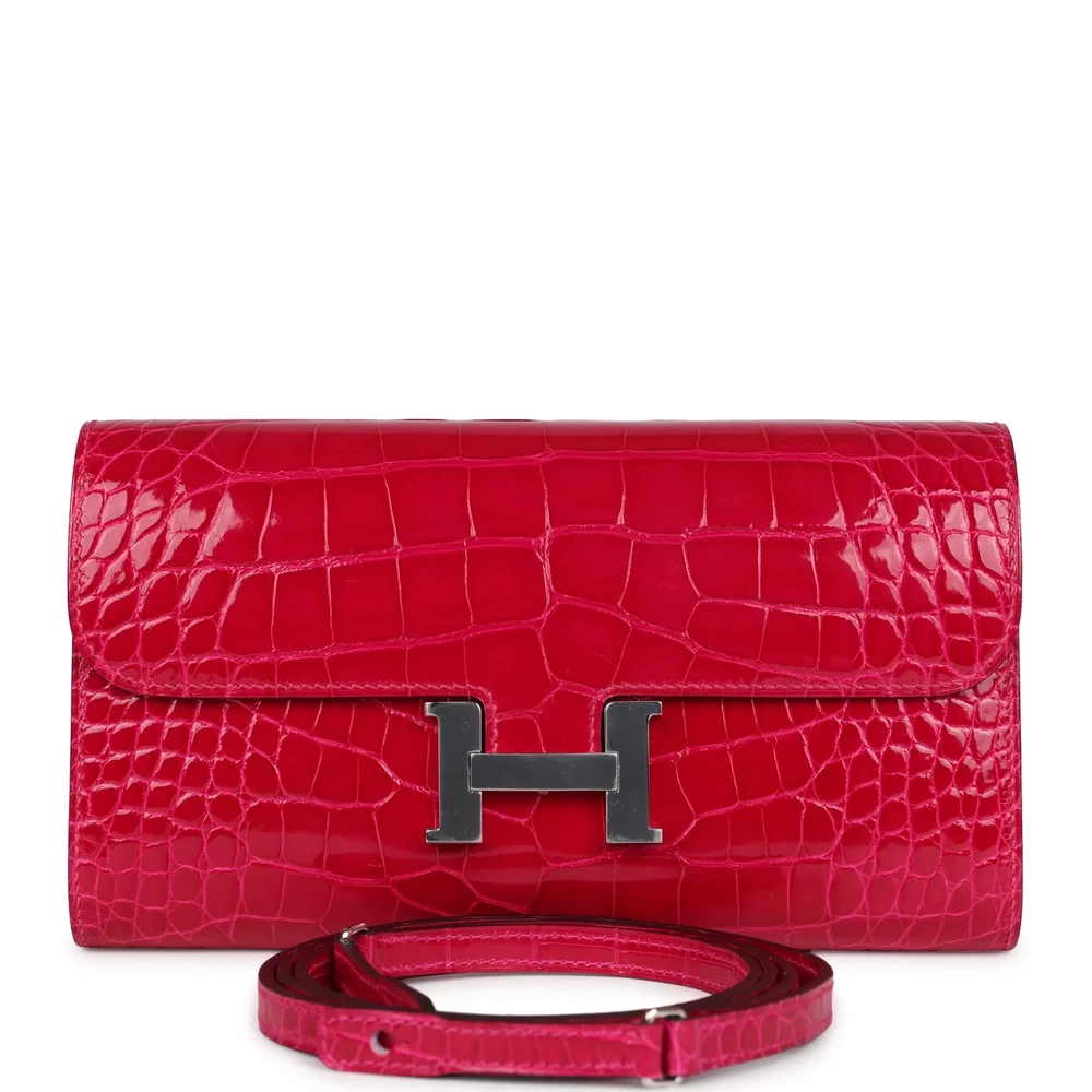 This Hermès Constance Wallet To Go in Rose Mexico is a radiant expression of high-end craftsmanship. Crafted from shiny alligator leather, its glossy finish enhances the bold pink hue, making it a standout yet timeless accessory. The signature “H” clasp in palladium hardware provides a polished contrast, while the crossbody strap ensures hands-free convenience. Designed for effortless sophistication, this wallet is a statement piece that embodies Hermès’ luxury heritage.