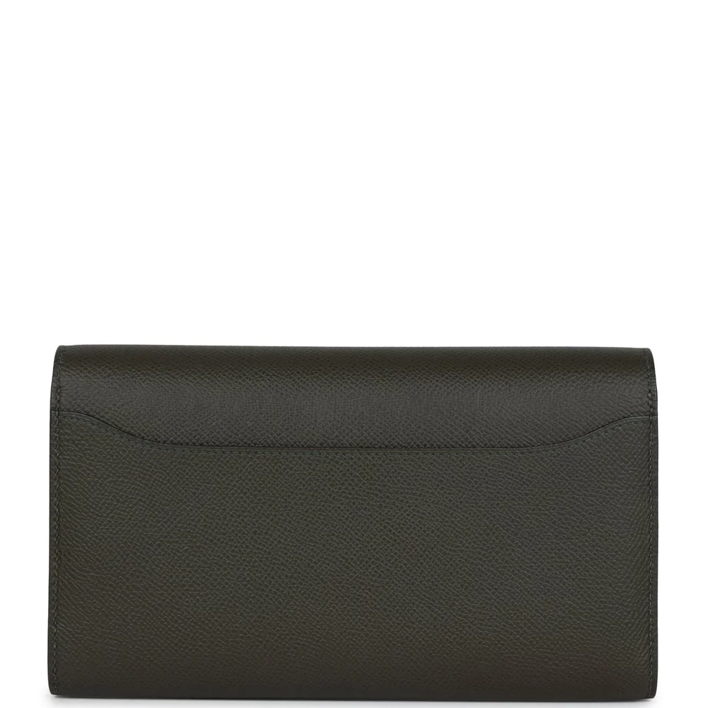 This Hermès Constance Wallet To Go in Vert de Gris is a timeless and understated masterpiece. Crafted from Epsom leather, its structured texture enhances the muted green-grey hue, creating a sophisticated and versatile aesthetic. The iconic “H” clasp in gold hardware adds warmth and elegance, while the detachable strap ensures practical styling. Designed for those who value refined simplicity, this wallet is a perfect addition to any collection.