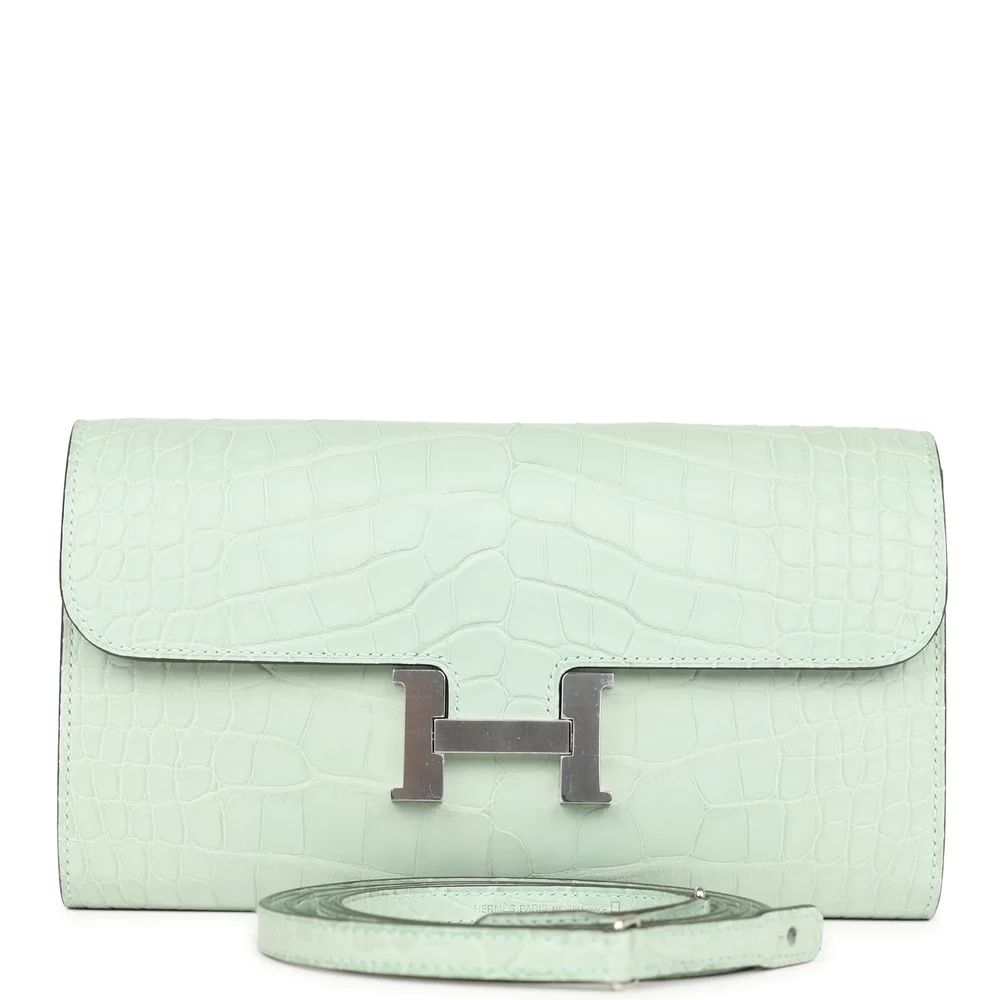 This Hermès Constance Wallet To Go in Vert d’Eau is a serene and luxurious piece. Crafted from matte alligator leather, its soft and velvety texture enhances the delicate aqua-green hue, offering a tranquil yet opulent aesthetic. The iconic “H” clasp in palladium hardware adds a polished touch, while the detachable strap ensures versatility. Designed for those who appreciate understated luxury, this wallet is a rare and refined treasure.