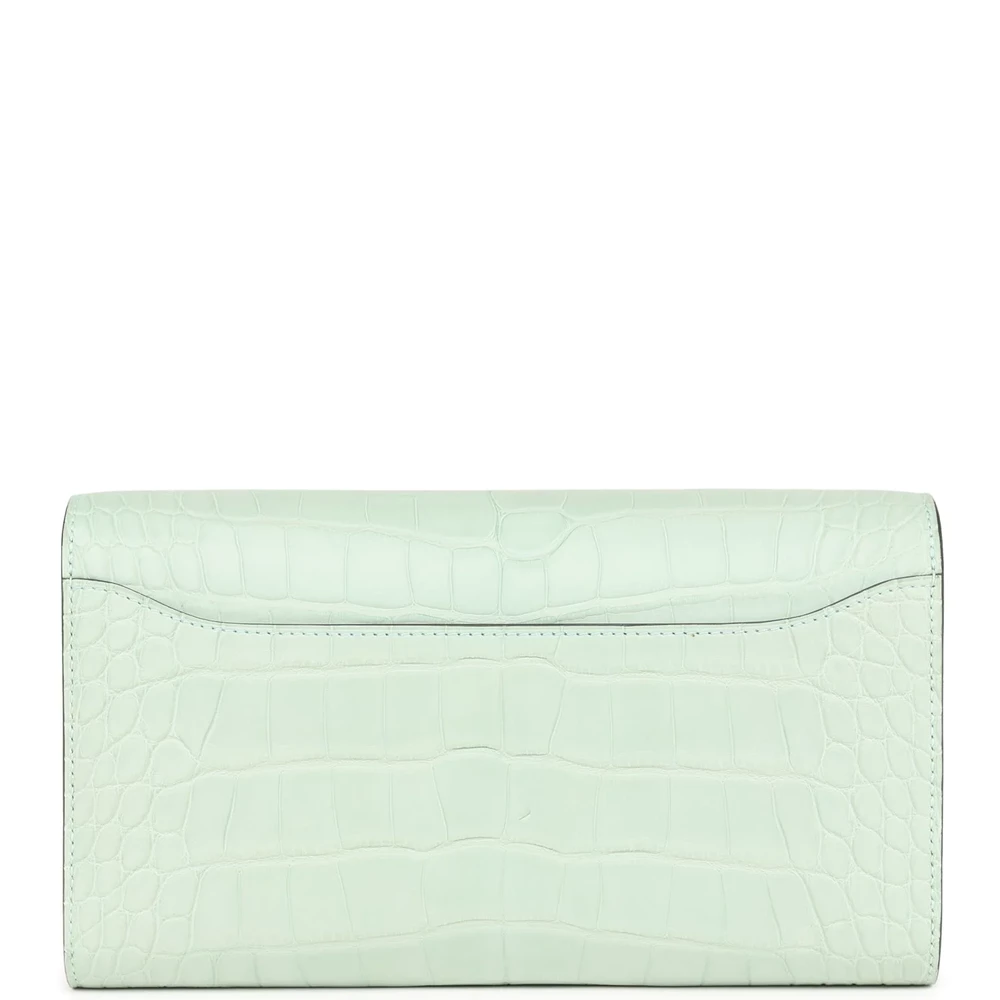 This Hermès Constance Wallet To Go exudes understated luxury with its Vert D’eau Matte Alligator leather. The palladium hardware enhances its refined aesthetic, offering a subtle yet striking contrast. Designed for the modern minimalist, it combines practicality with unparalleled craftsmanship. Its compact form holds essentials effortlessly, making it a versatile companion. A testament to Hermès’ dedication to excellence, it is a piece that speaks volumes in quiet sophistication.