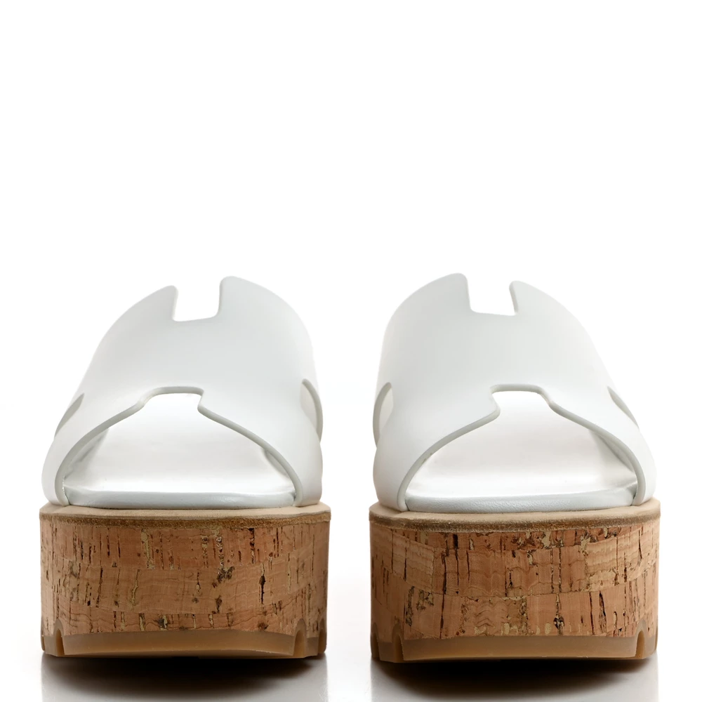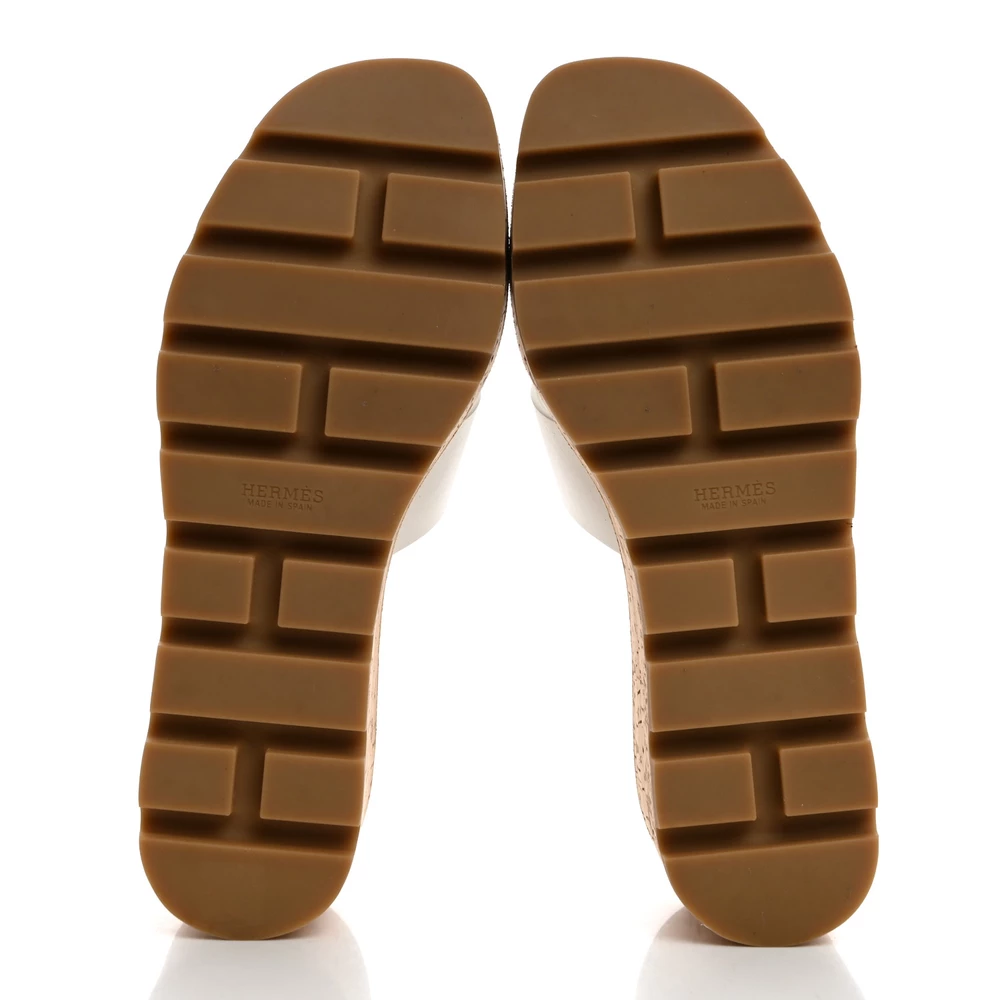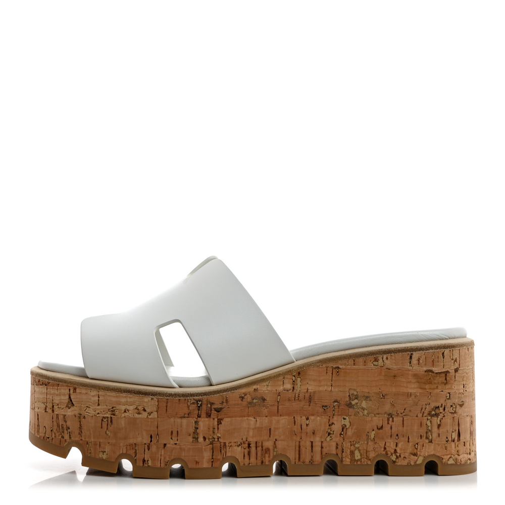 This Hermès Eze 30 sandal in White calfskin and cork is a fresh and comfortable summer essential. The soft leather straps contrast beautifully with the natural cork sole, offering both style and lightweight comfort. Designed with a 30mm platform, it provides subtle elevation while maintaining ease of wear. Whether paired with breezy dresses or tailored shorts, this sandal adds effortless charm.