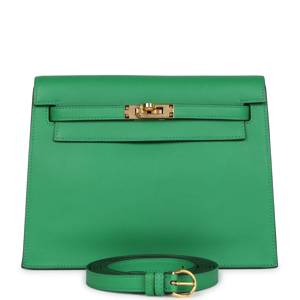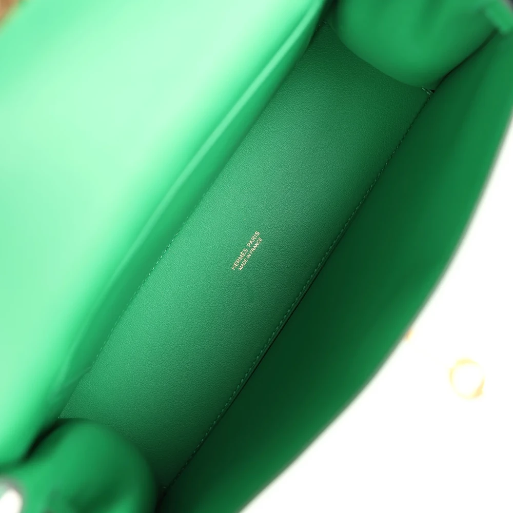 This Hermès Kelly Danse in Bambou is a unique and versatile statement piece. Made from supple Swift leather, it features a modern and functional design. The Gold hardware adds a touch of elegance. Its vibrant green hue is perfect for adding a pop of color to your wardrobe. The spacious interior offers practicality and style. A must-have for collectors. This bag is a true Hermès treasure.