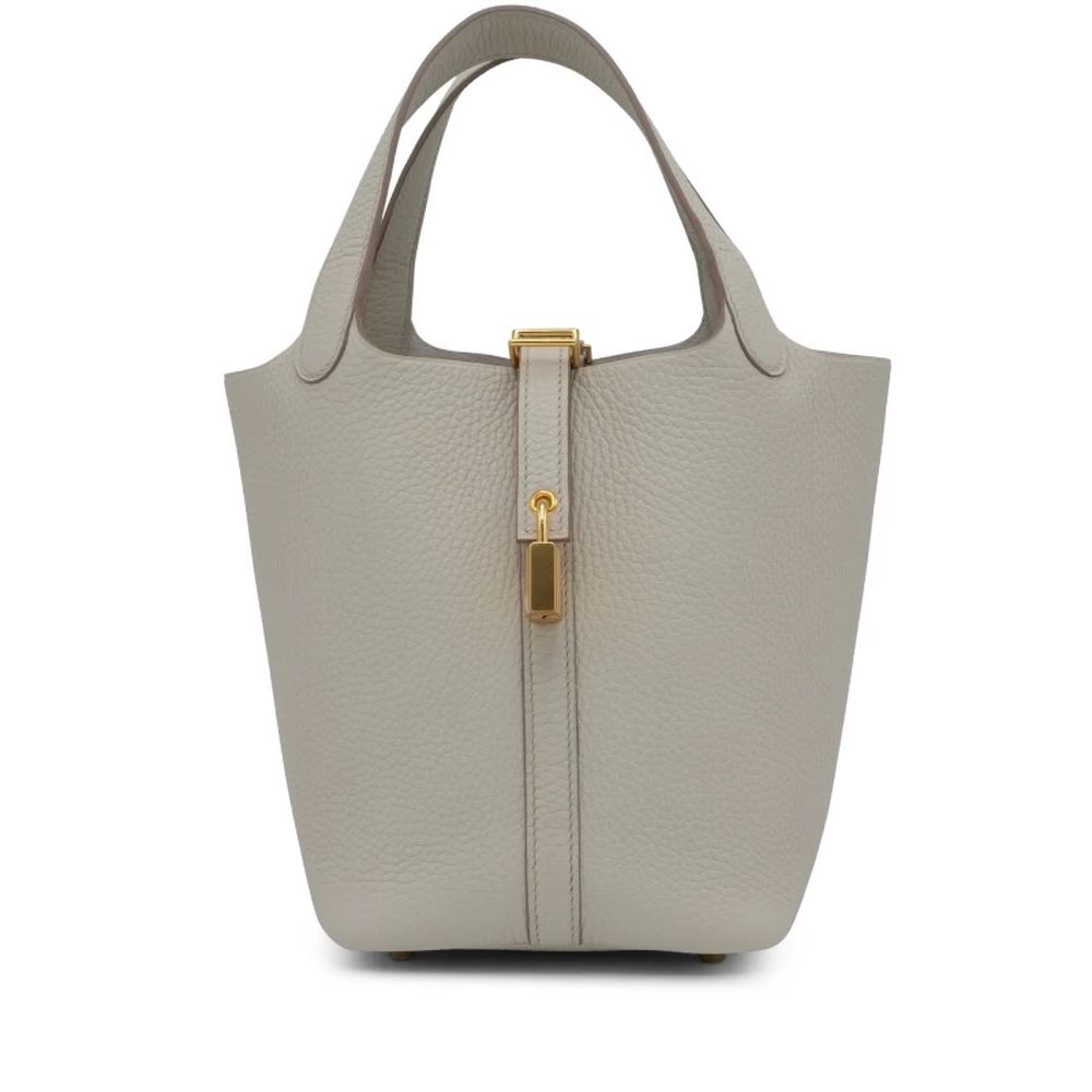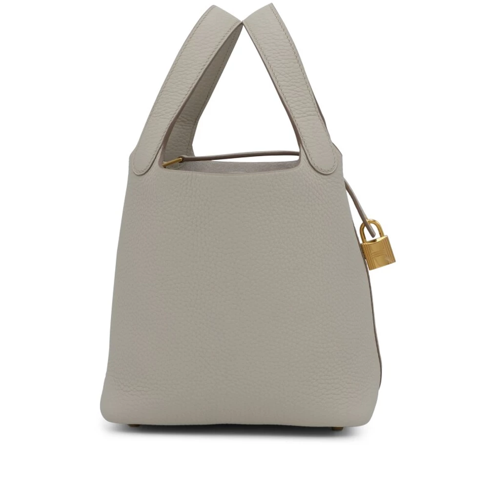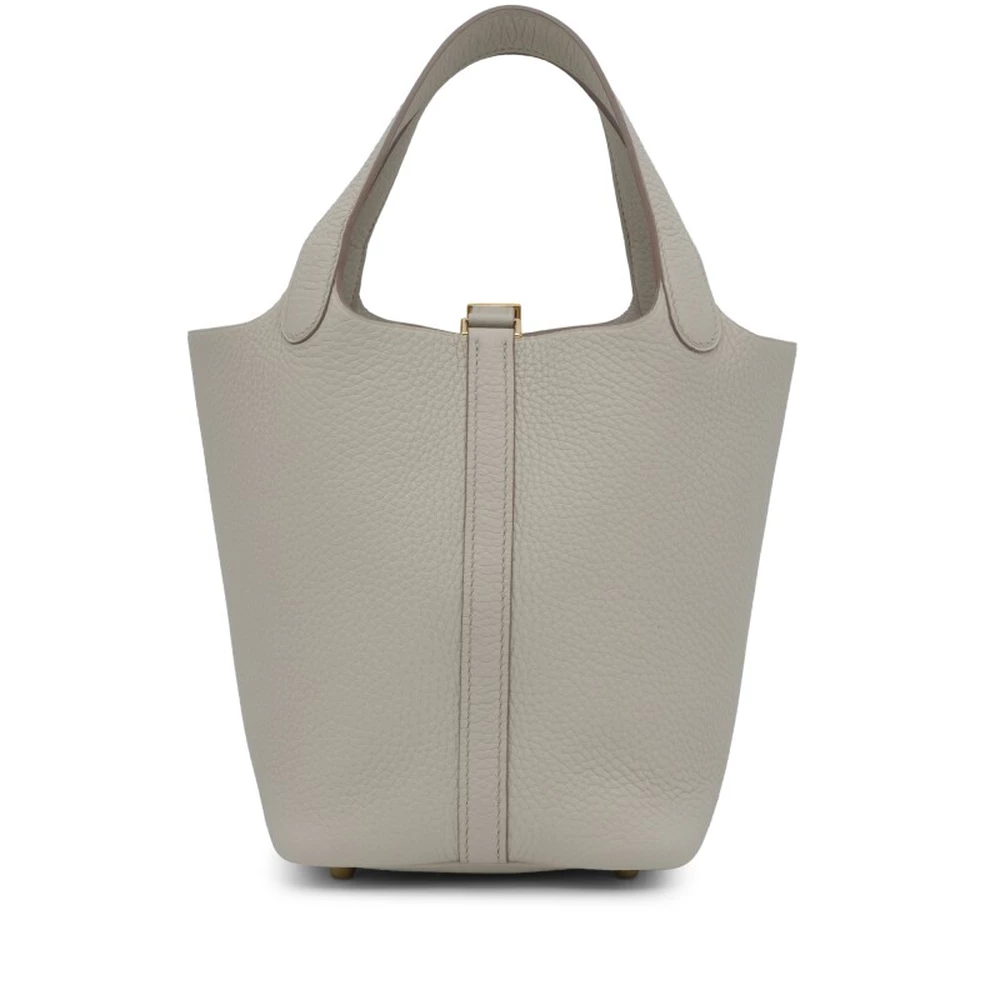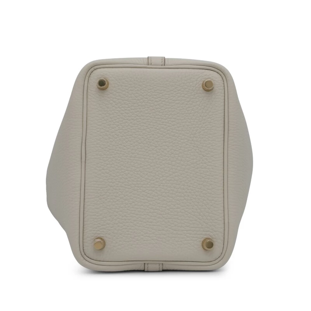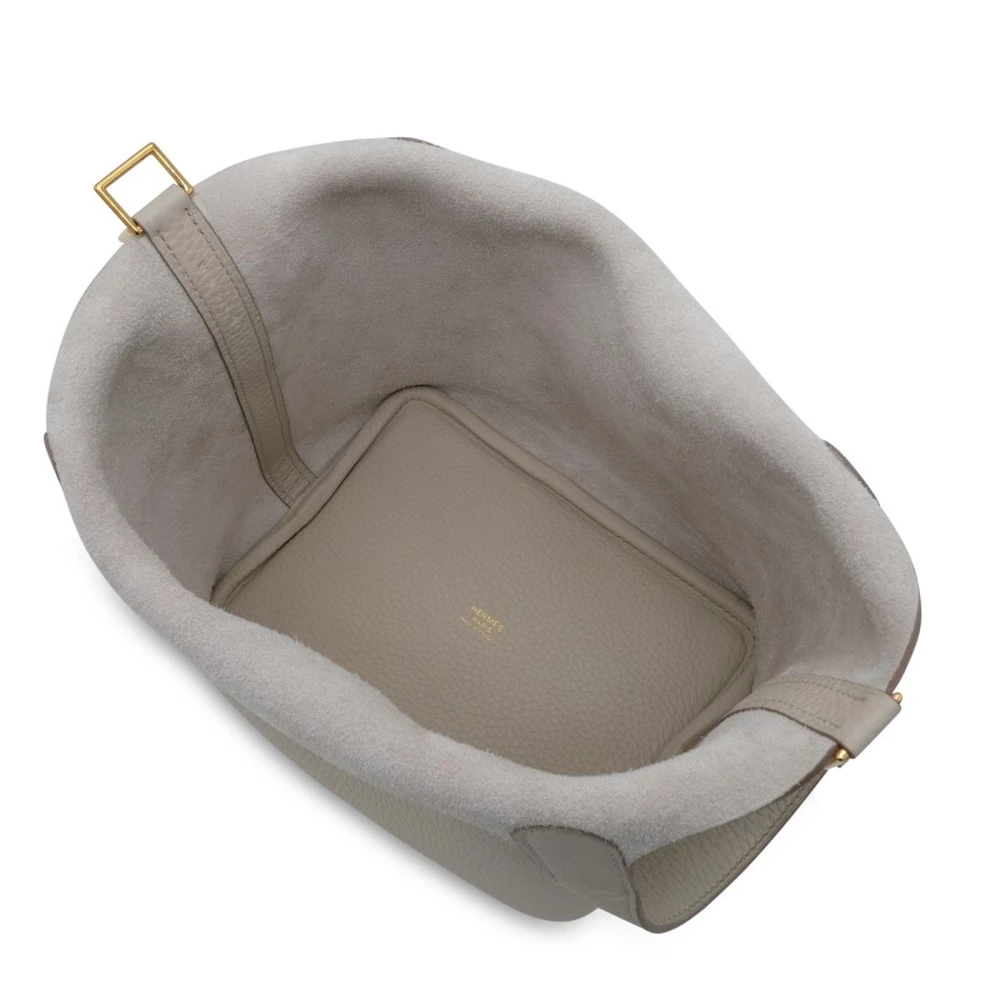 This Hermès Béton Clémence Picotin Lock 18 with Gold Hardware is an elegant and neutral-toned handbag in a soft, off-white shade. The Clémence leather’s natural grain provides a luxurious texture, while the gold-plated hardware adds warmth and refinement. The open-top bucket design is both stylish and functional. This Picotin is a timeless and effortlessly chic addition to any collection.
