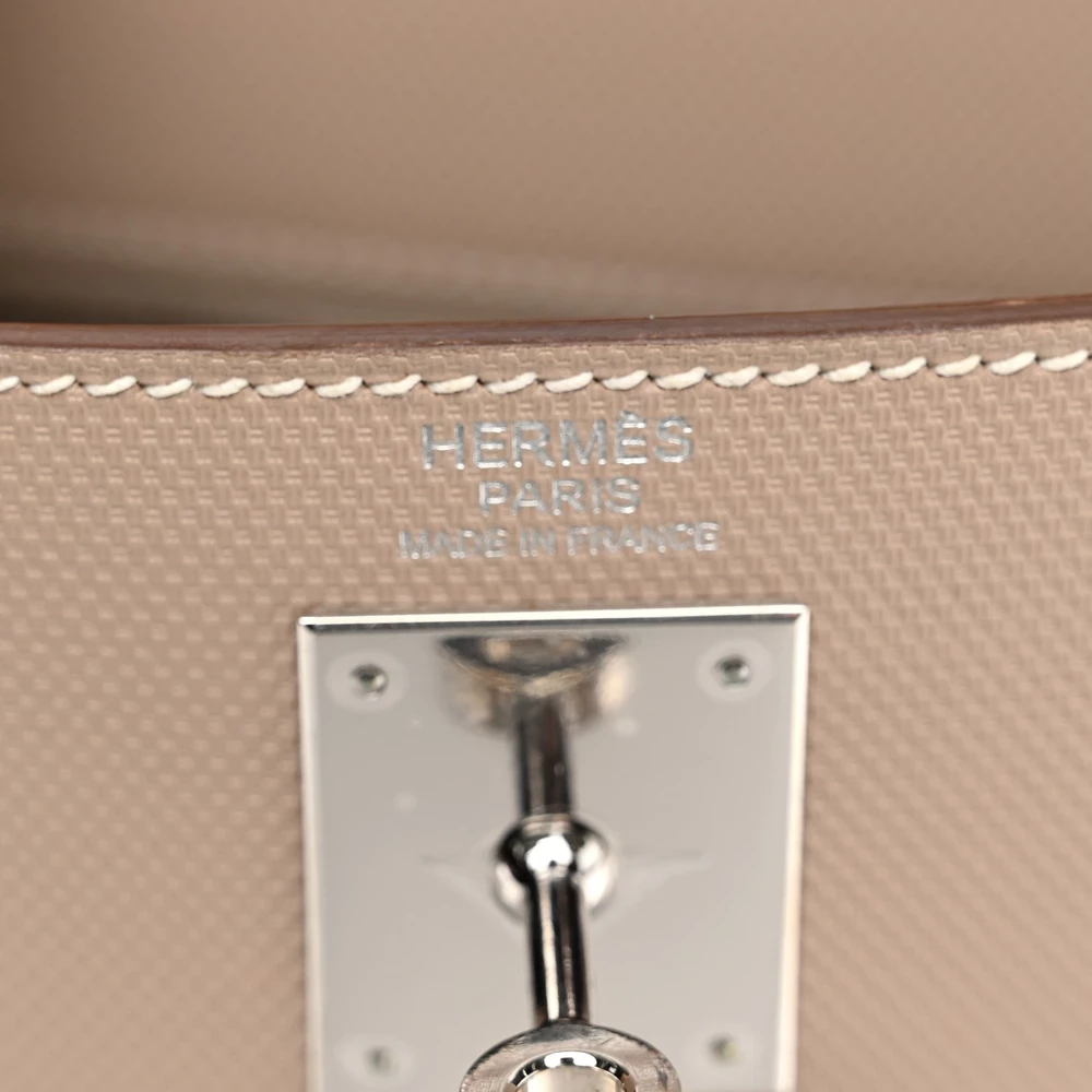 This Hermès Grain d’H Kelly Sellier 32 Argile is a unique handbag featuring the distinctive Grain d’H leather, known for its rich texture. The Argile shade is a sophisticated neutral, offering versatility for various occasions. The 32 cm size provides ample space while maintaining its elegant structure. Palladium hardware enhances its modern and refined appeal. This Kelly is a perfect choice for those who appreciate rare and tactile leathers.