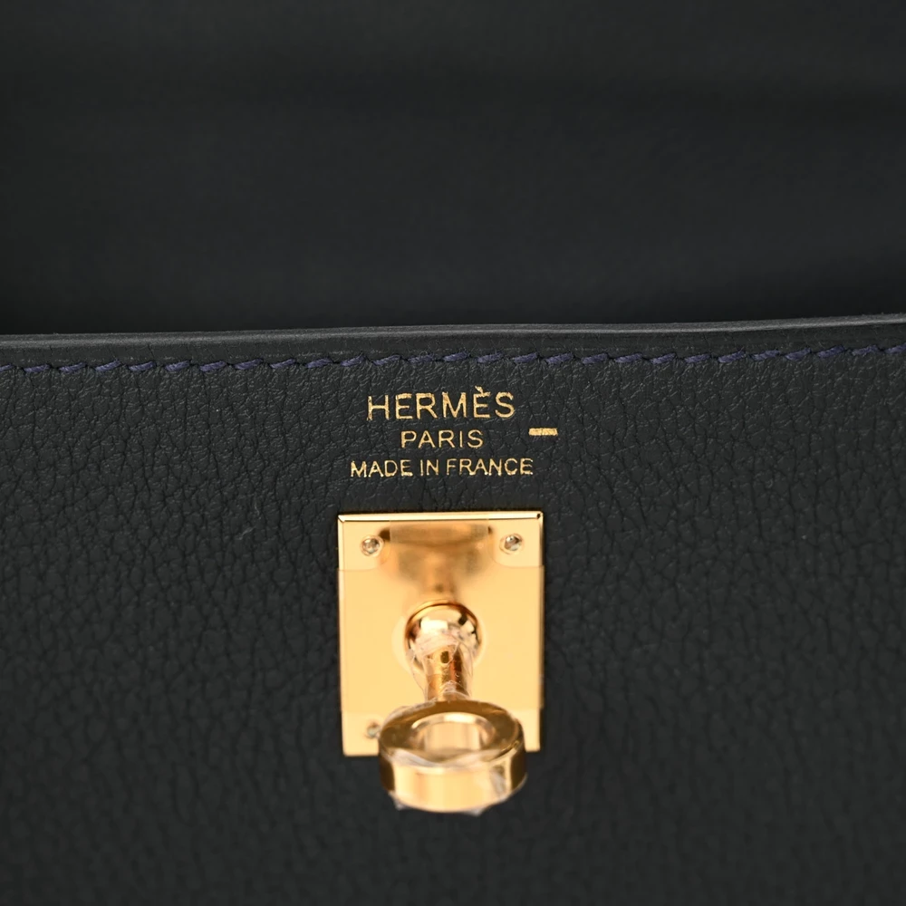 This Hermès Togo Lizard Kelly Retourne Touch 25 Vert Rousseau Vert Cypress is a rare and luxurious handbag with an exotic accent. The Togo leather body is complemented by glossy lizard leather on the handle and straps, adding a unique texture contrast. The deep green tones exude sophistication and versatility. The 25 cm size makes it an elegant choice for both day and evening wear. This Kelly is a refined and rare piece that showcases Hermès’ exquisite craftsmanship.