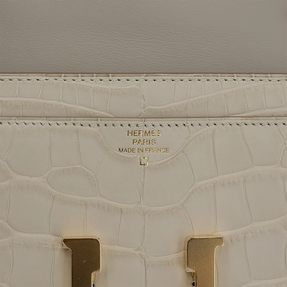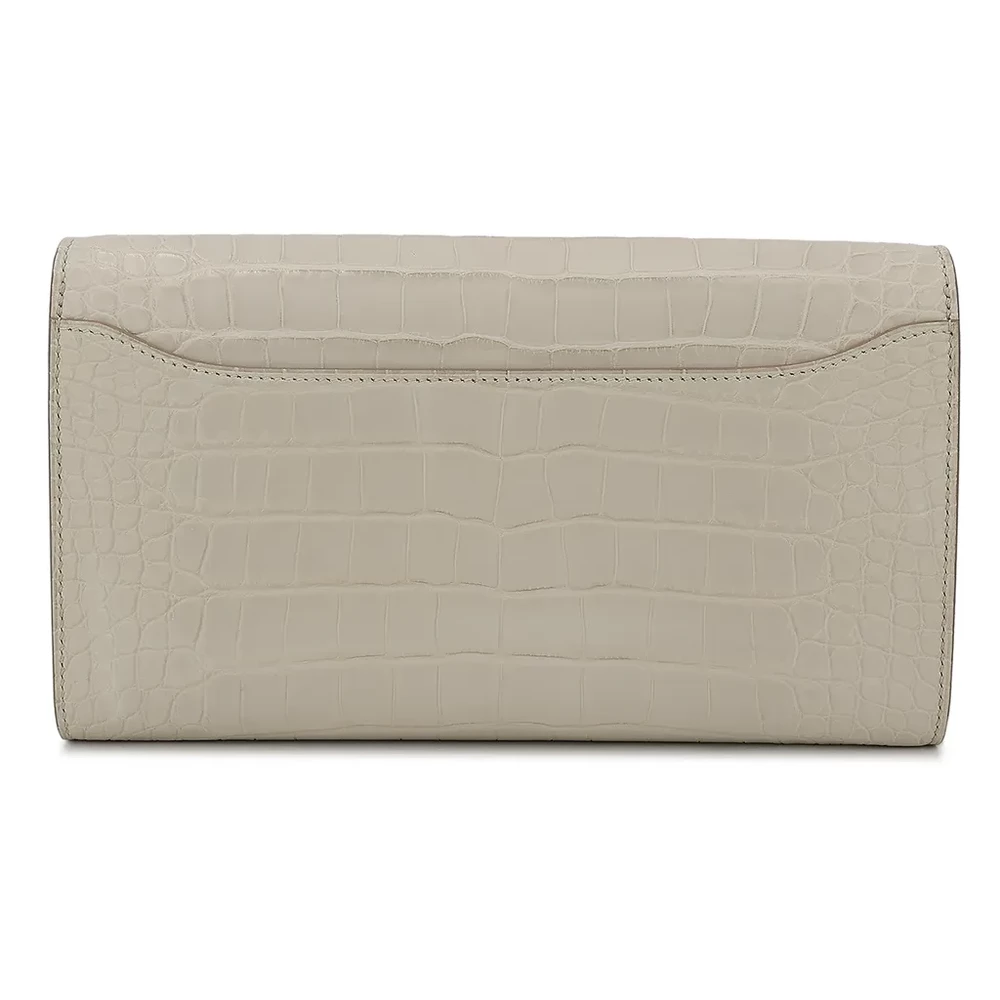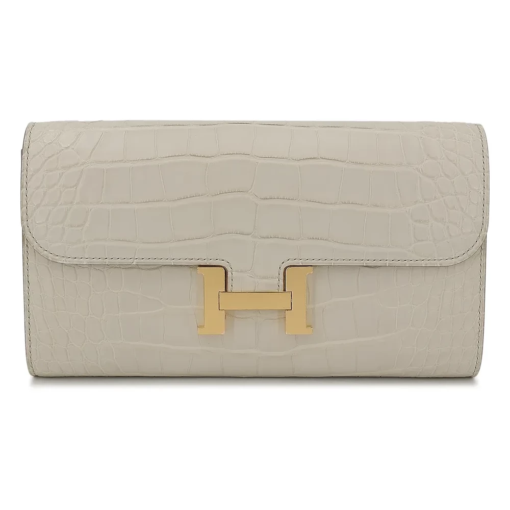 This Hermès Constance Wallet in Beton (8L) is an exquisite piece crafted from luxurious alligator leather. The neutral Beton hue is elegantly paired with gold hardware, enhancing its sophisticated appeal. Measuring approximately 20.5cm in width and 11.5cm in height, this wallet offers both style and functionality. It features a U blind stamp from 2022 and comes with a dustbag, shoulder strap, CITES certificate, receipt, and box. This rare and collectible piece is currently located in Hong Kong.