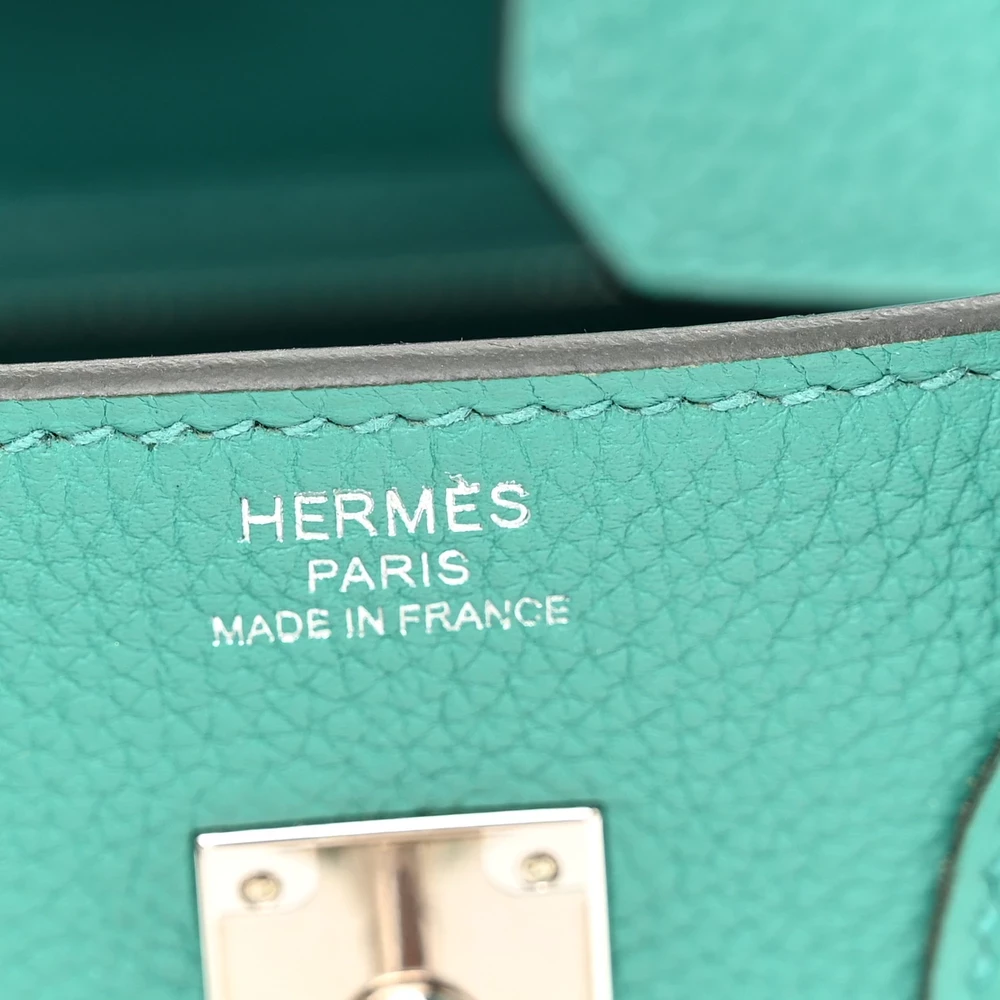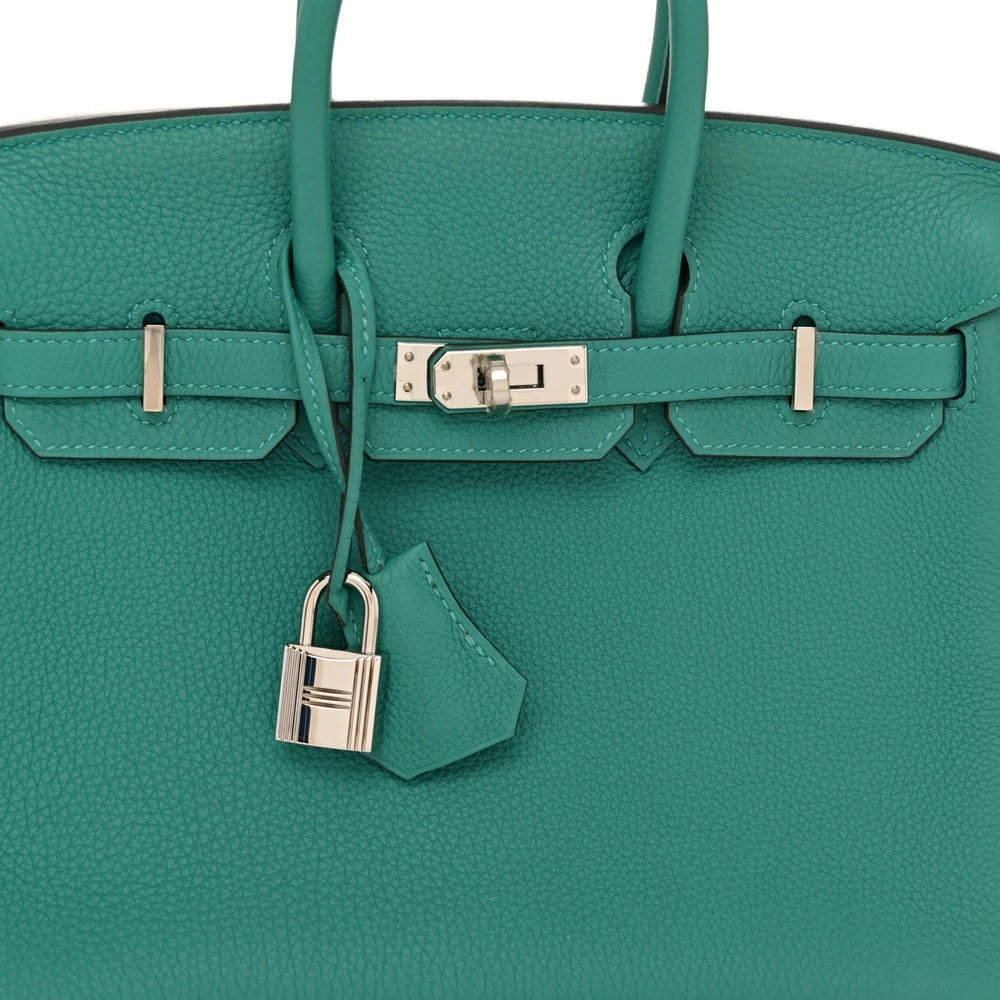 This Hermès Togo Birkin 25 in Vert Vérone is a charming and elegant handbag in a fresh green shade. The grained Togo leather provides durability and a slightly structured silhouette. Measuring 25 cm, it is compact yet luxurious for everyday elegance. Palladium hardware enhances the cool tone of Vert Vérone, creating a refined and contemporary look. This is a rare and stylish piece for those who love unique greens.