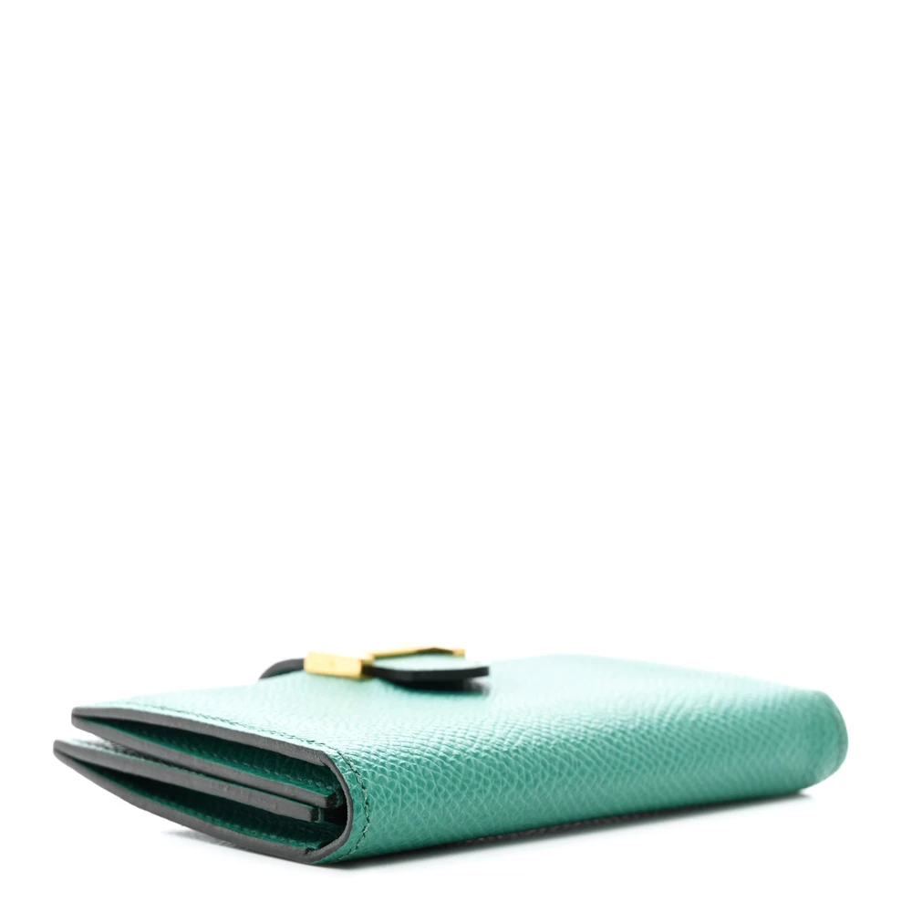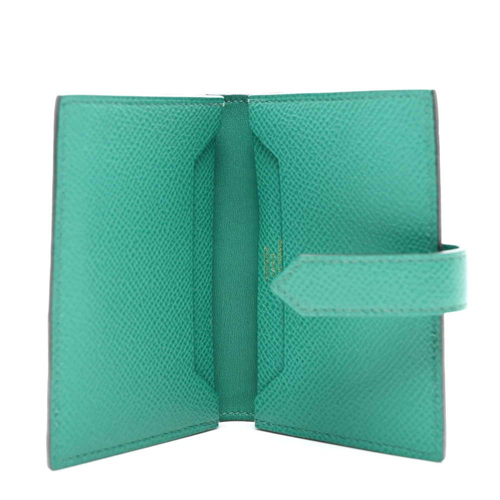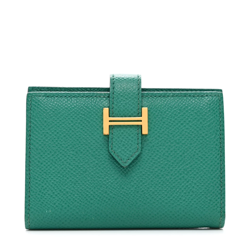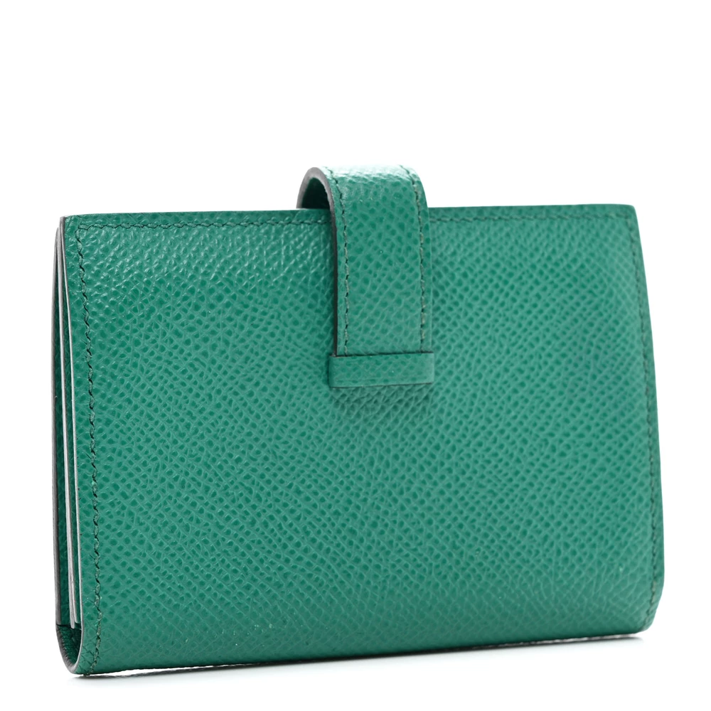 This Hermès Epsom Bearn Card Holder Wallet in Green is a sophisticated accessory crafted from finely textured Epsom calfskin leather in a vibrant green hue. Secured with a gold-plated Hermès ‘H’ clasp, the sleek leather strap adds a timeless touch. The interior opens to reveal card slots and two spacious compartments, perfect for organizing essentials. Compact yet elegant, this wallet reflects Hermès’ dedication to craftsmanship and classic design.