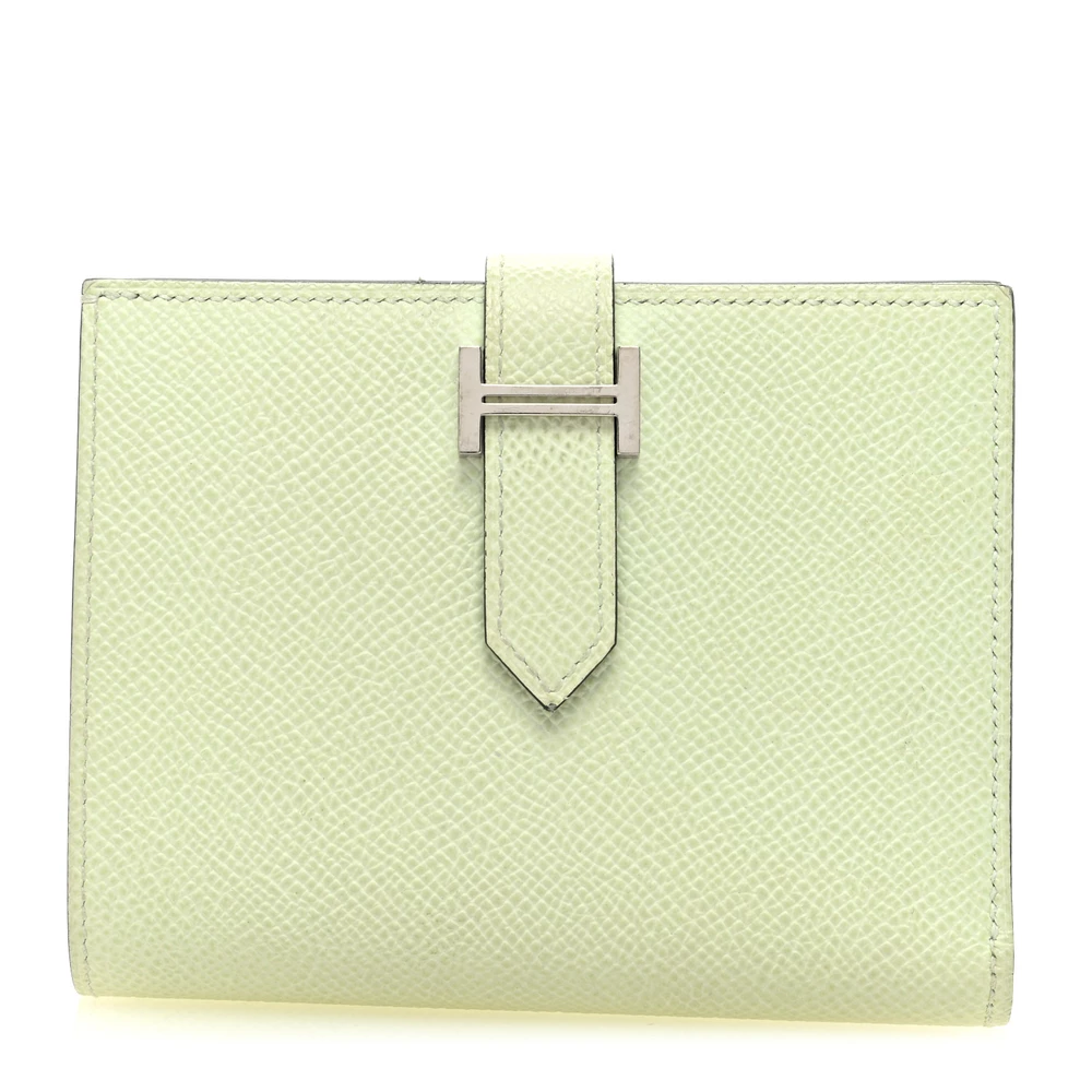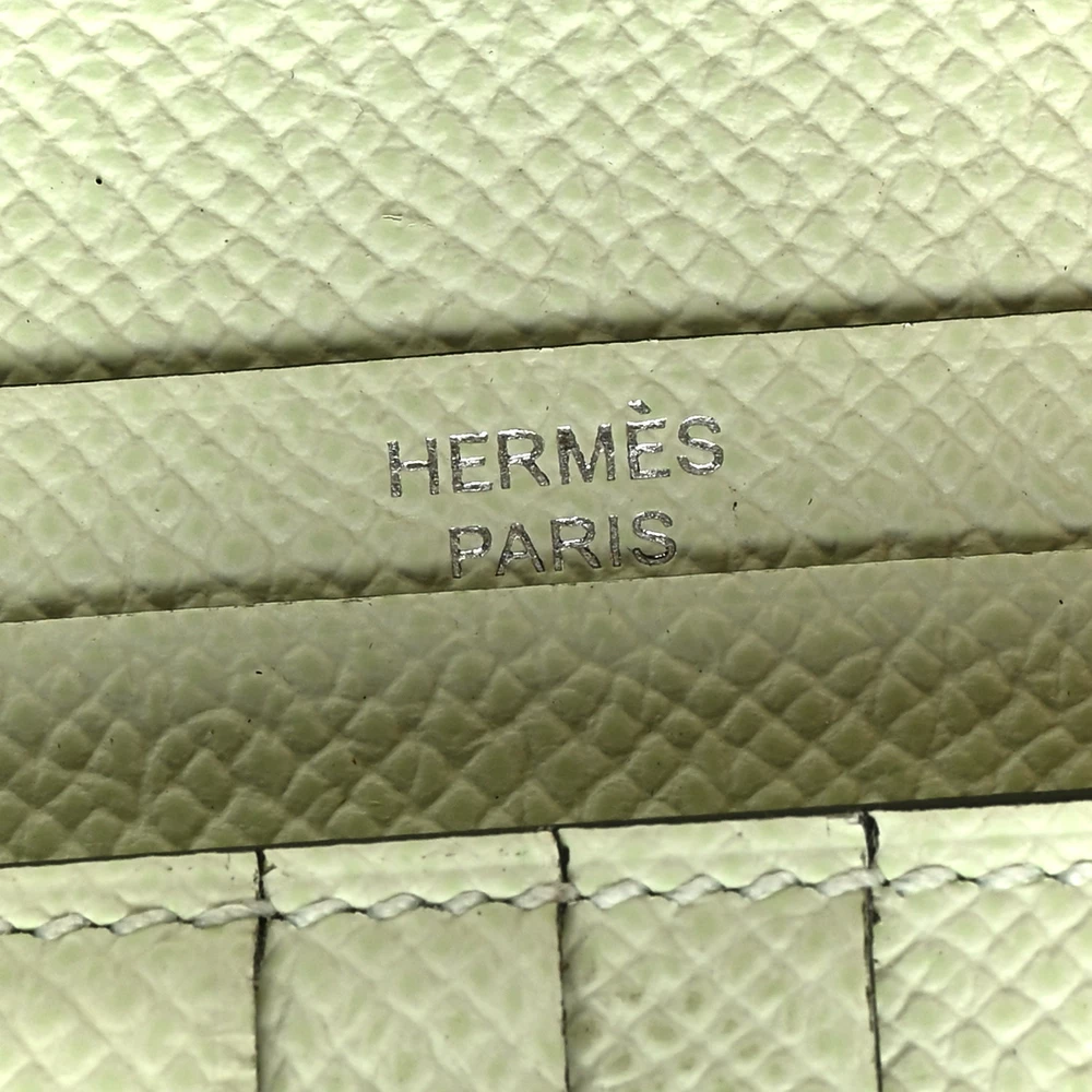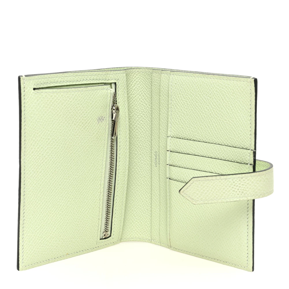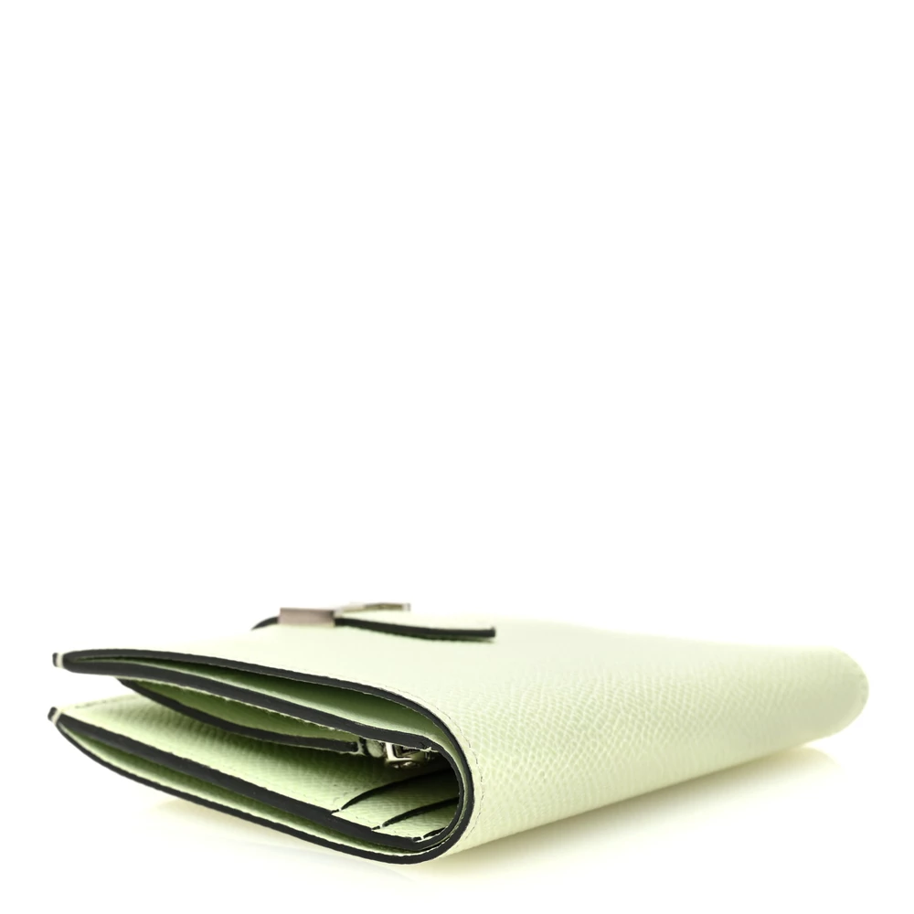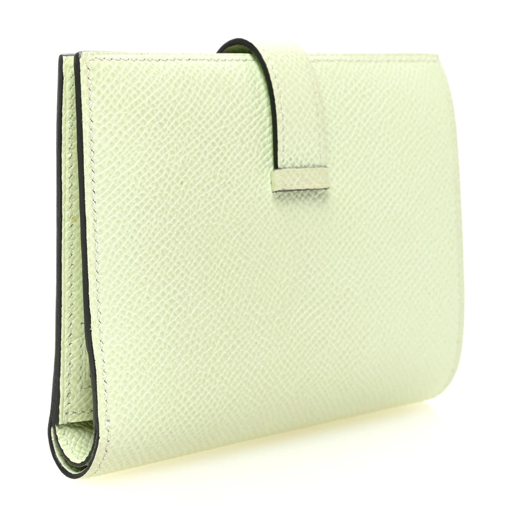 This Hermès Epsom Bearn Compact Wallet in Vert Fizz is a stunning blend of elegance and practicality. Crafted from richly textured Epsom calfskin leather in a refreshing green shade, this chic wallet features a cross-over strap and the iconic polished silver Hermes H clasp, adding a touch of luxury. Upon opening, the wallet reveals a well-organized interior, complete with a card slot panel, patch pockets, and a small zipper compartment, perfect for storing essentials securely. Its compact size makes it an ideal accessory for both everyday use and special occasions, exuding sophistication with every detail.