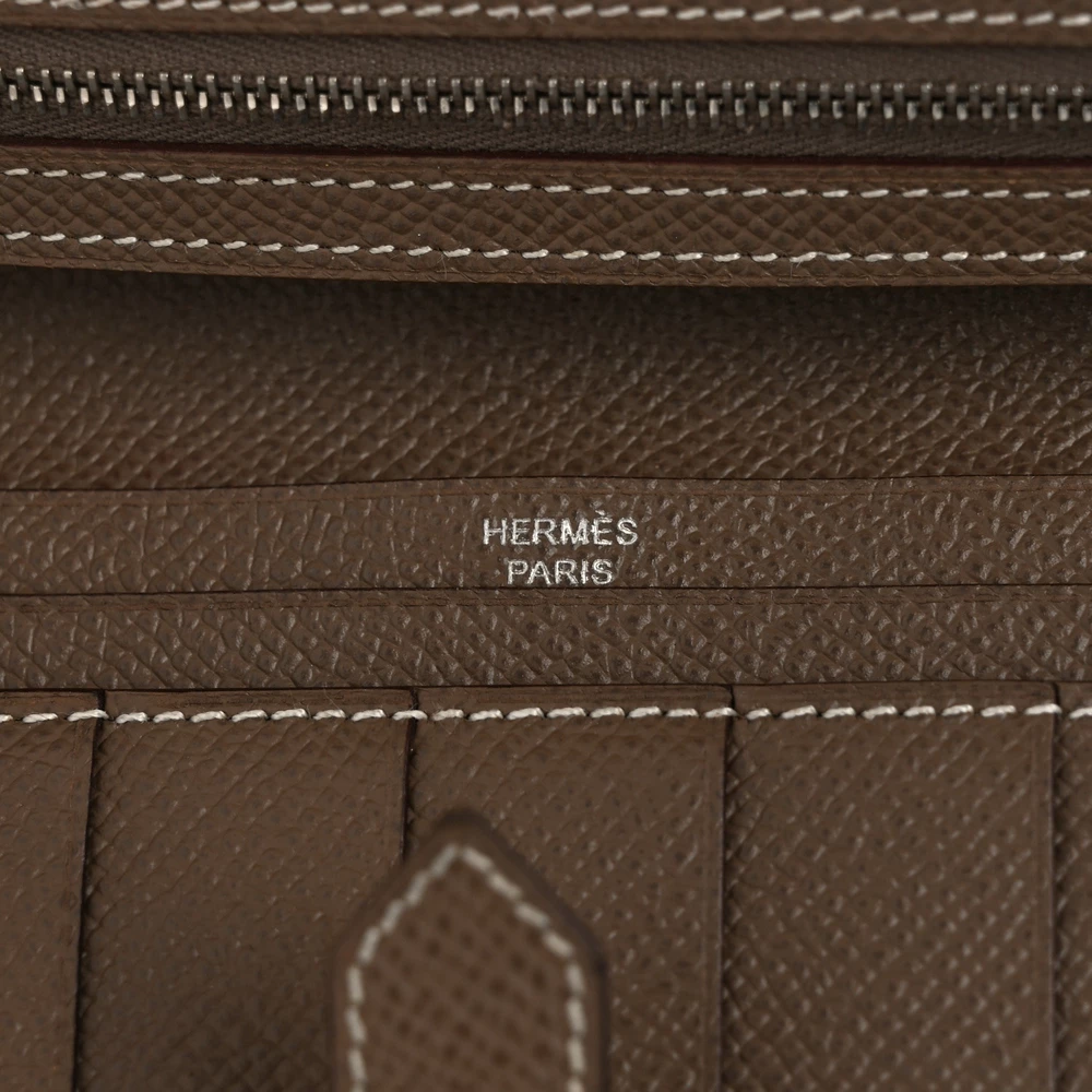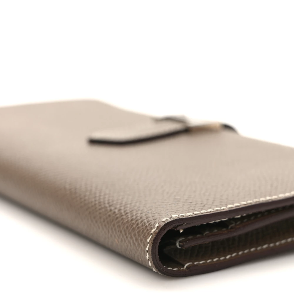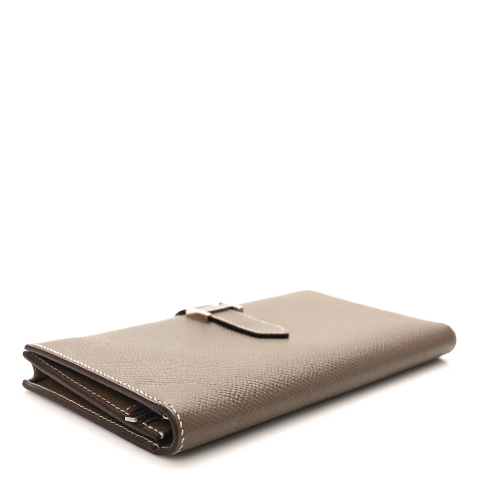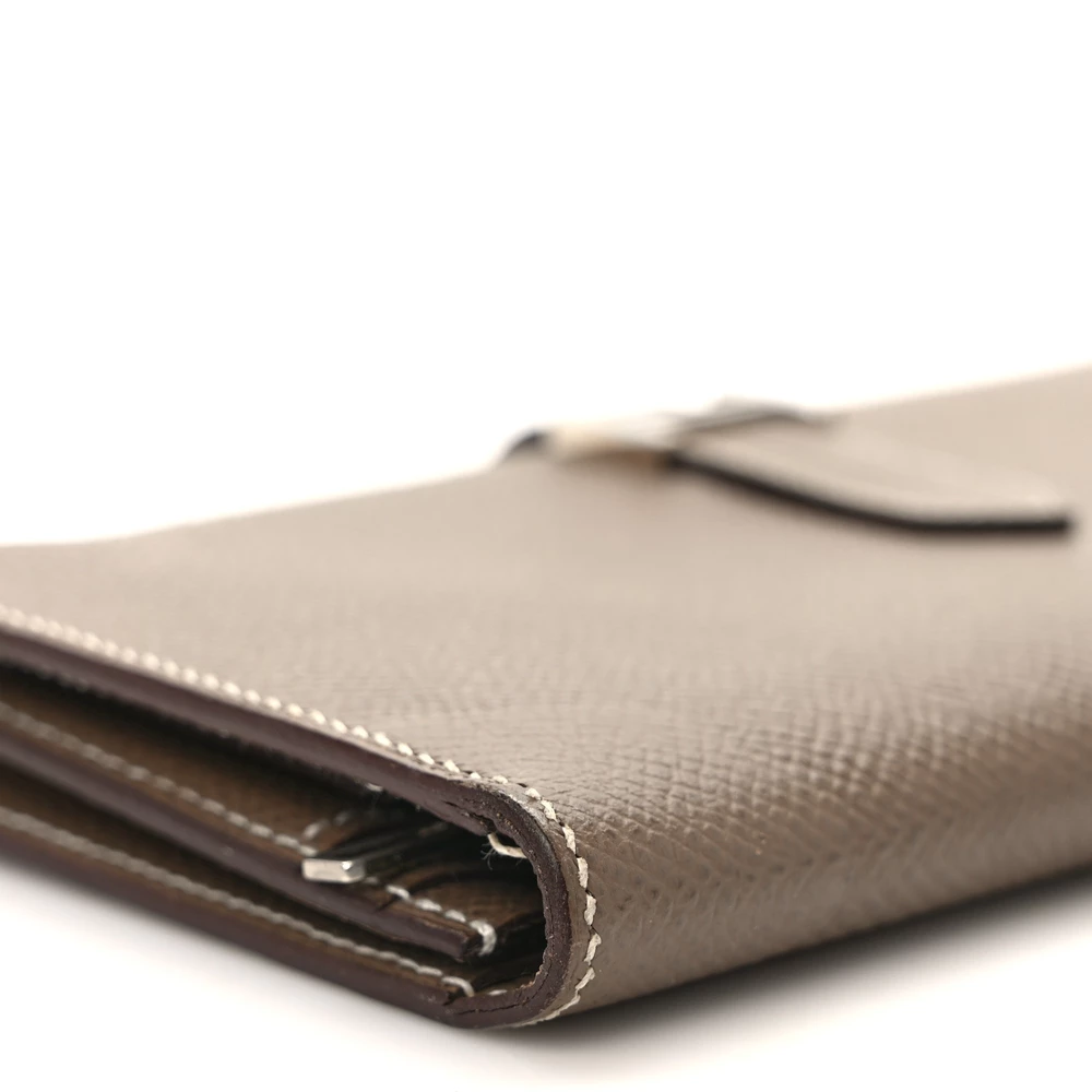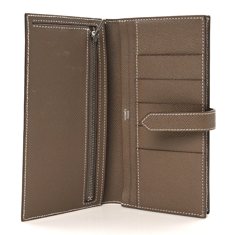 This Hermès Epsom Bearn Gusset Wallet in Etoupe is a sophisticated and practical accessory. Crafted from fine Epsom calfskin leather in a neutral taupe shade, it exudes understated luxury. The wallet features a sleek strap closure with palladium hardware, offering a refined and secure fastening. Inside, the matching leather interior is thoughtfully designed with card slots, patch pockets, and a zipper compartment, providing ample space for all your essentials. This wallet combines elegance with functionality, making it a perfect addition to any luxury collection.