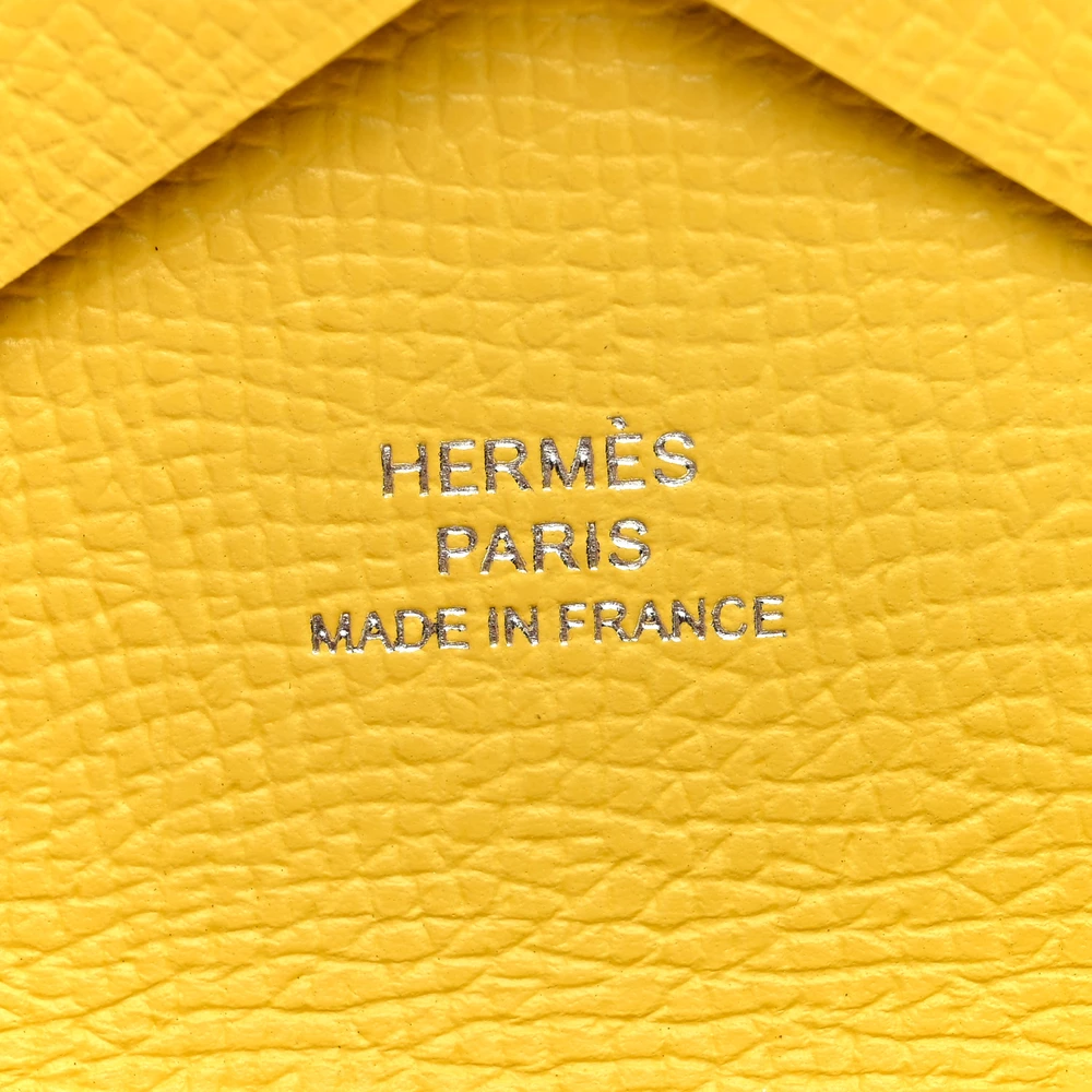 This Hermès Epsom Calvi Duo Card Case in Jaune De Naples is a bright and sophisticated accessory. Crafted from durable Epsom calfskin leather in a vibrant yellow hue, it adds a cheerful touch to any ensemble. The snap closure opens to a matching interior, thoughtfully designed with a pocket for cards and a dedicated coin compartment for added functionality. Compact and stylish, this card case embodies Hermès’ commitment to refined craftsmanship and timeless elegance.