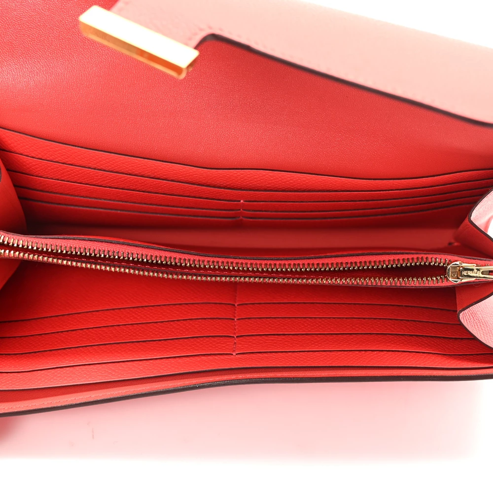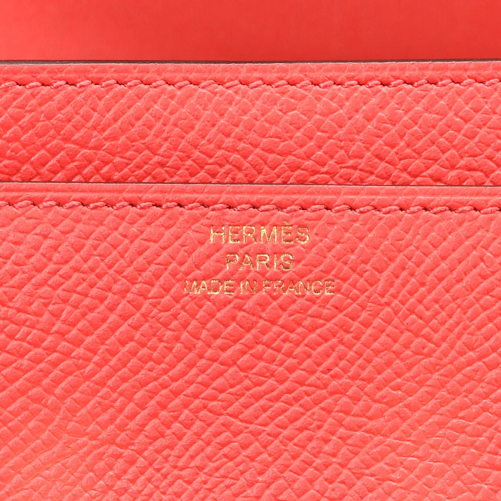 This Hermès Epsom Constance Long Wallet in Rose Jaipur is a stunning expression of elegance and sophistication. Crafted from luxuriously textured Epsom calfskin leather, it boasts a vibrant coral pink hue that exudes a fresh and feminine charm. The wallet features the iconic gold-plated H clasp for a secure strap closure, adding a touch of refined luxury. Upon opening, the interior reveals a well-organized design, including two card slot panels, a central zipper pocket divider, and spacious bill compartments, ensuring optimal functionality. This wallet perfectly blends style with practicality, making it a must-have accessory for those who appreciate Hermès’ renowned craftsmanship and attention to detail. Ideal for both day-to-day use and special occasions, it’s a versatile piece that elevates any collection.