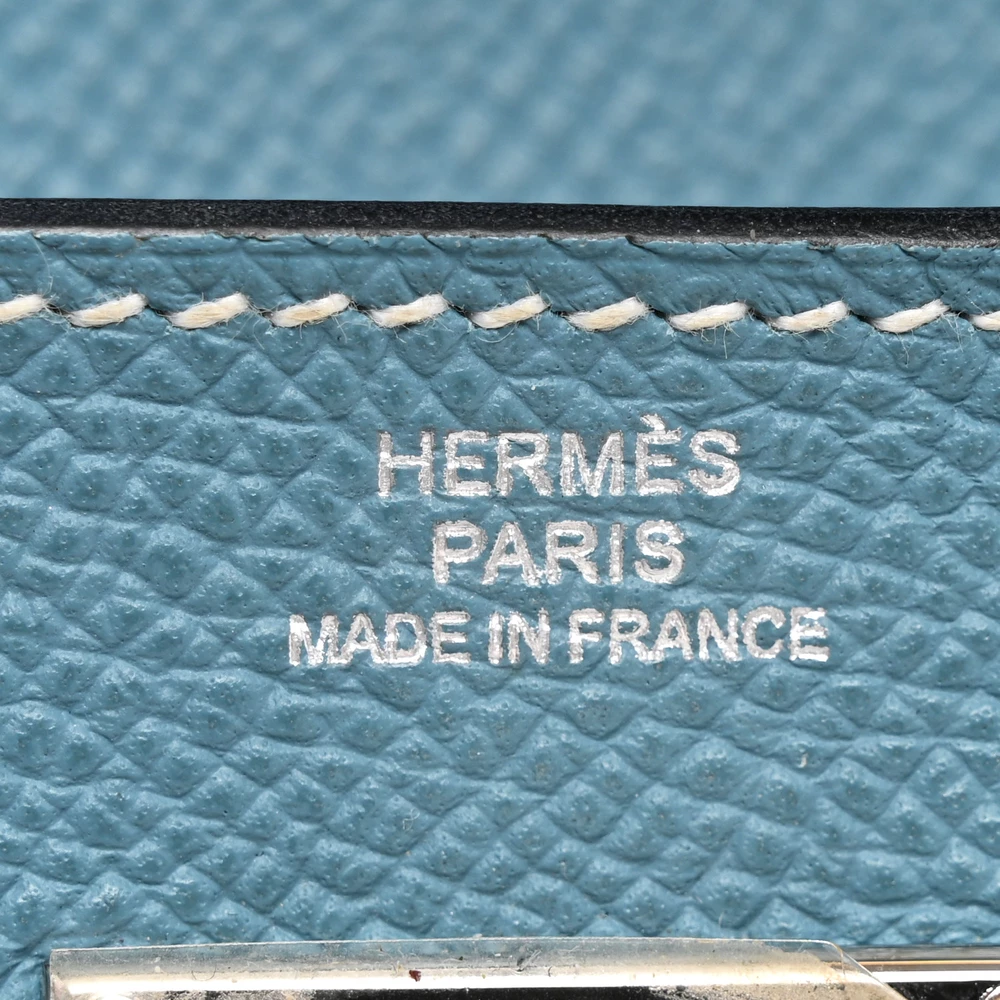 The Hermès Epsom Kelly Longue Wallet in Blue Jean exudes timeless elegance. Crafted from textured Epsom calfskin leather in a soft light blue hue, it features the iconic Kelly flap with a strap closure and palladium-plated turn-lock. The flap opens to a matching leather interior, thoughtfully designed with two card slot panels offering twelve slots, a partitioned zipper compartment, and flat pockets for seamless organization. A sophisticated accessory that blends style and practicality.