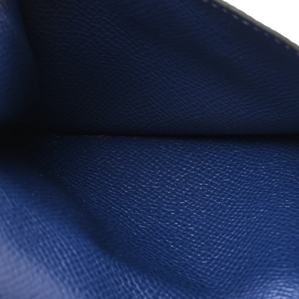 This Hermès Epsom Tricolor Kelly Pocket Compact Wallet in Black, Rouge, and H Bleu Saphir is a true masterpiece of craftsmanship and design. Finely crafted from Epsom leather, this wallet combines a bold black and burgundy exterior with a striking touch of H Bleu Saphir leather inside. The front flap is adorned with a polished gold-plated Kelly signature turn-lock, offering both security and sophistication. Upon opening, the wallet reveals a luxurious blue leather interior, featuring ample space for cards and essentials. Additionally, it includes a convenient rear zipper pocket for coins or small items. This compact yet elegant wallet is the perfect blend of functionality and high-end style, making it an essential piece for any luxury collector.