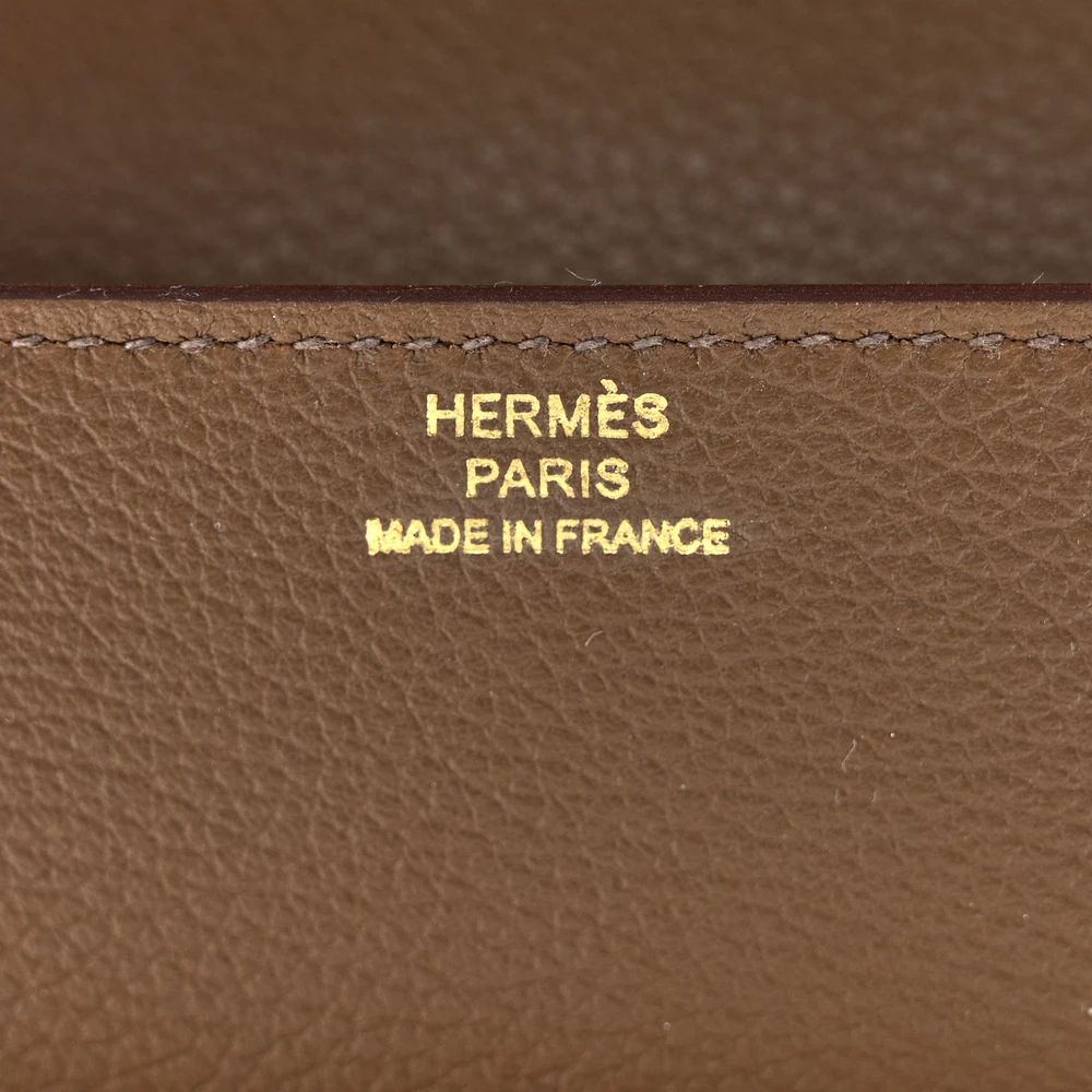 This Hermès Evercolor Bi-color Roulis Slim Wallet in Etoupe and Craie is a sleek and versatile wallet that blends practicality with luxury. Crafted from pebbled calfskin leather in a sophisticated grey Etoupe, it is paired with a soft off-white Craie hue for a striking bi-color effect. The wallet features a gold-plated H clasp, adding a touch of opulence to its refined design. Inside, the matching leather interior offers multiple card slots for easy organization, while the removable off-white zipper pocket insert provides extra functionality. This slim wallet is perfect for those who appreciate elegant minimalism with a modern twist.