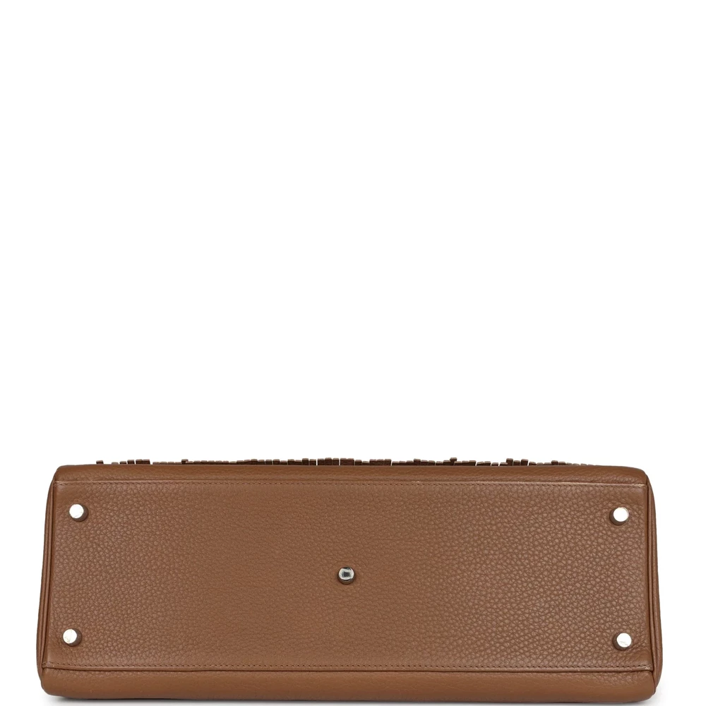 This Hermès Fringe Shoulder Kelly 42 in Alezan is a bold and luxurious statement. Made from supple Clemence leather, it features a unique fringe detailing. The Palladium hardware adds a modern touch. Its rich brown hue is perfect for making a bold statement. The spacious interior offers practicality and style. A must-have for collectors. This bag is a true Hermès masterpiece.