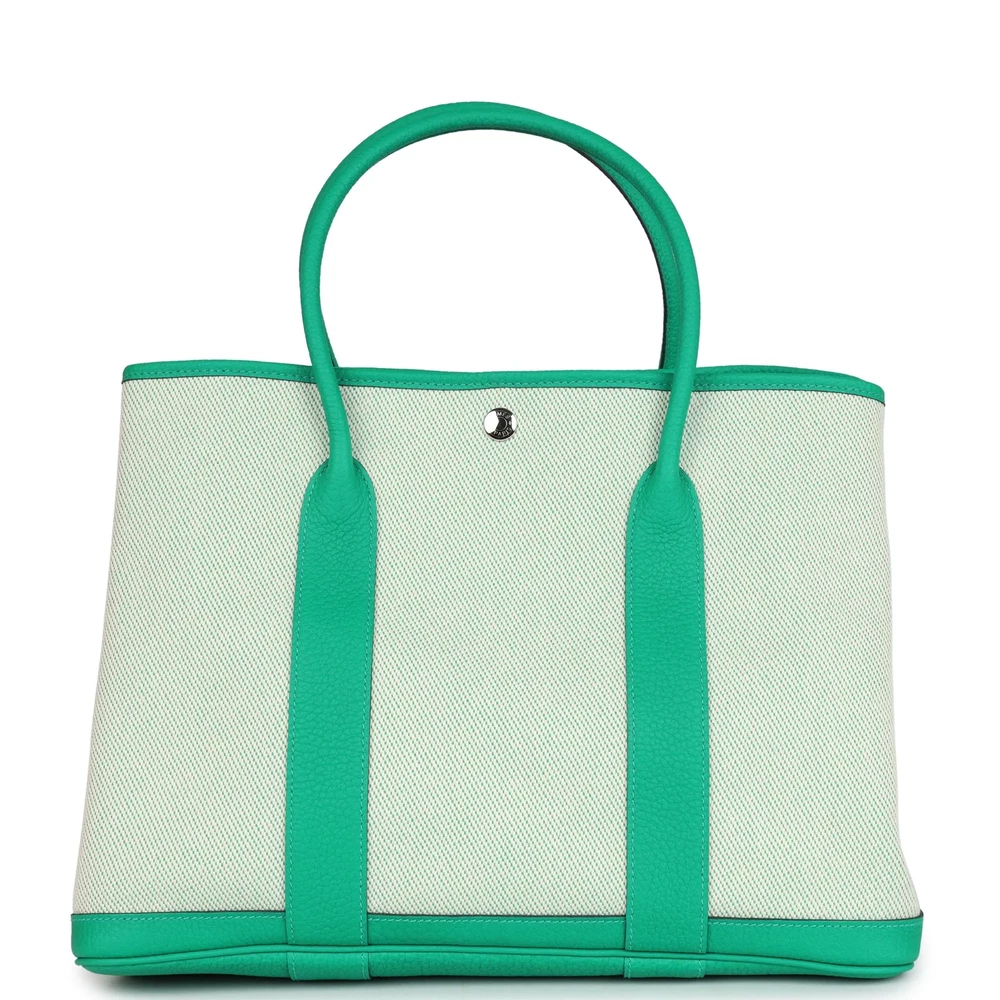 This Hermès Garden Party 36 in Menthe Toile H and Negonda leather is a fresh and vibrant accessory, accented by palladium hardware. Its soft green hue and contrasting textures create a sophisticated look, perfect for any occasion. Spacious and lightweight, it is ideal for everyday use. A testament to Hermès’ craftsmanship, it is a must-have for those who appreciate timeless elegance.