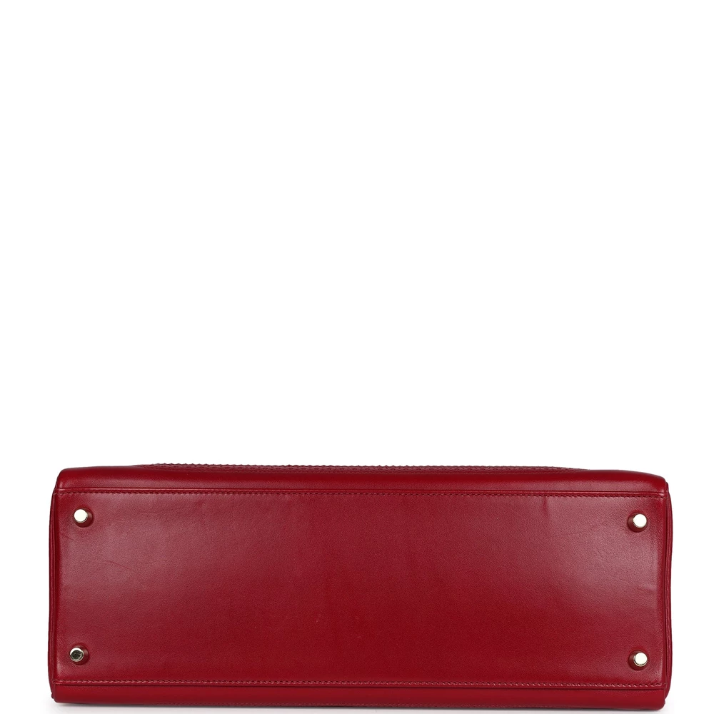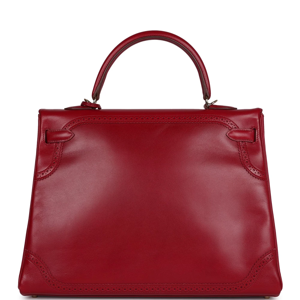 This Hermès Ghillies Kelly Retourne 35 in Rubis is a unique and luxurious statement. Made from smooth Tadelakt leather, it features intricate perforated detailing. The Permabrass hardware adds a modern touch. Its deep red hue is perfect for making a bold statement. The spacious interior provides ample room for essentials. A must-have for collectors. This bag is a true Hermès treasure.