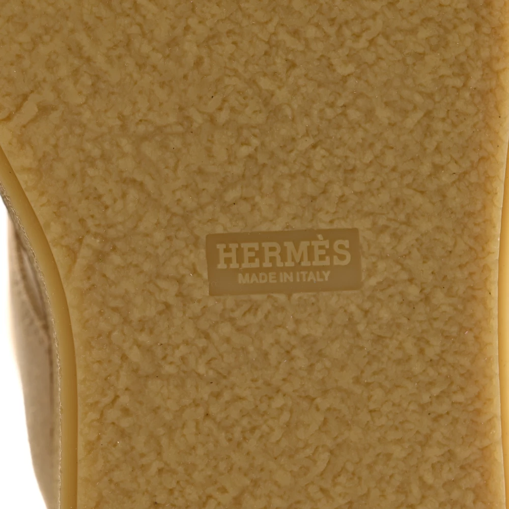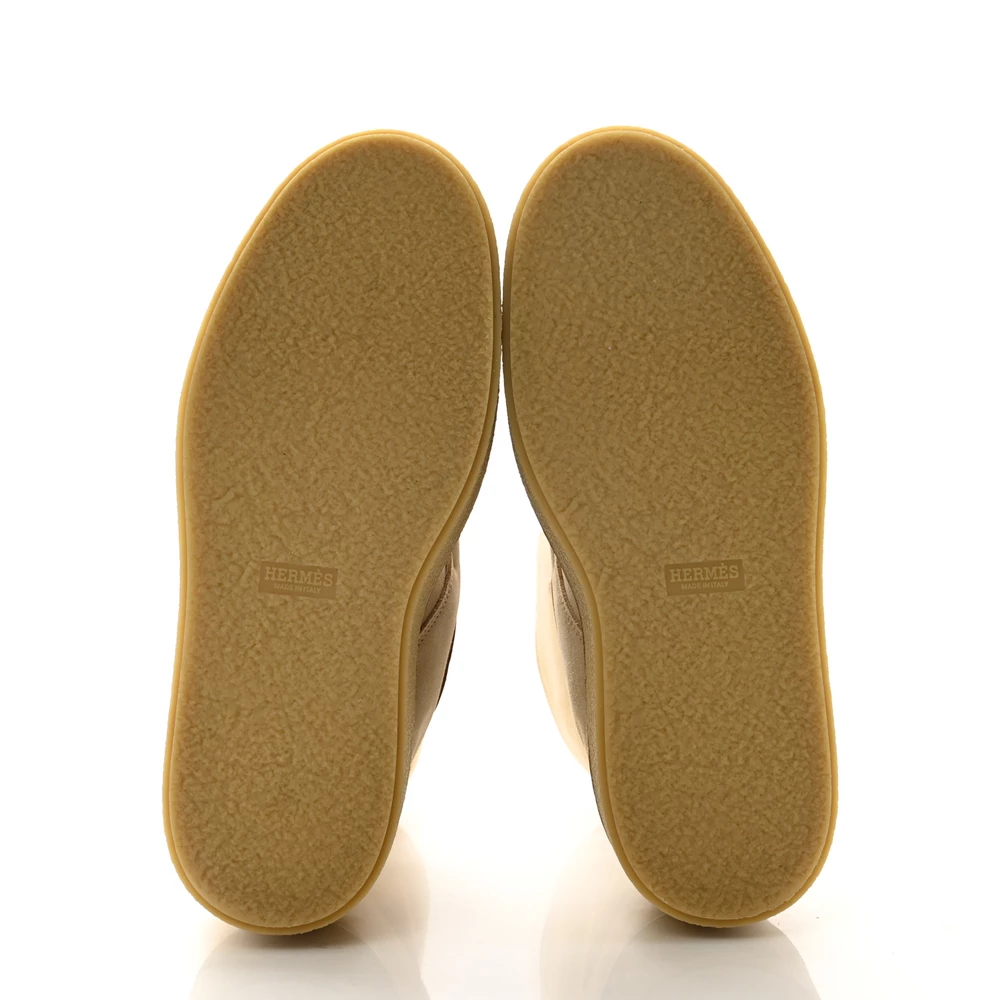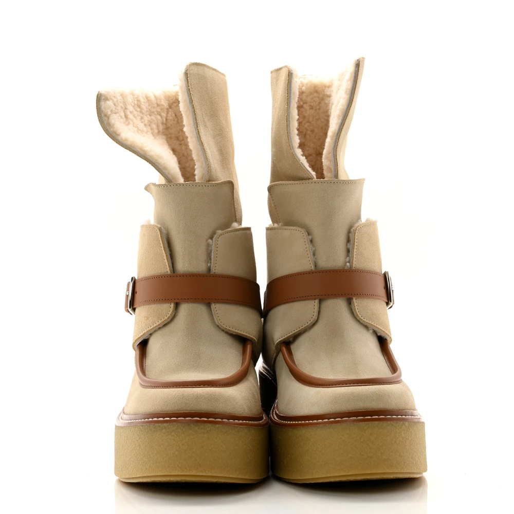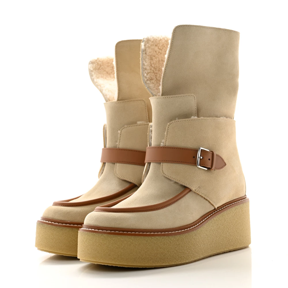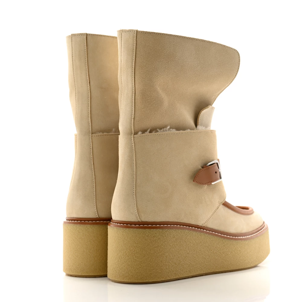 This Hermès Hemisphere ankle boot in Beige Palomino suede and shearling is a luxurious and cozy winter essential. The plush shearling lining ensures warmth, while the soft suede adds a touch of sophistication. Designed with a sturdy sole for durability, it offers both comfort and style. Whether worn with casual layers or sleek outerwear, this boot is perfect for cold-weather dressing.