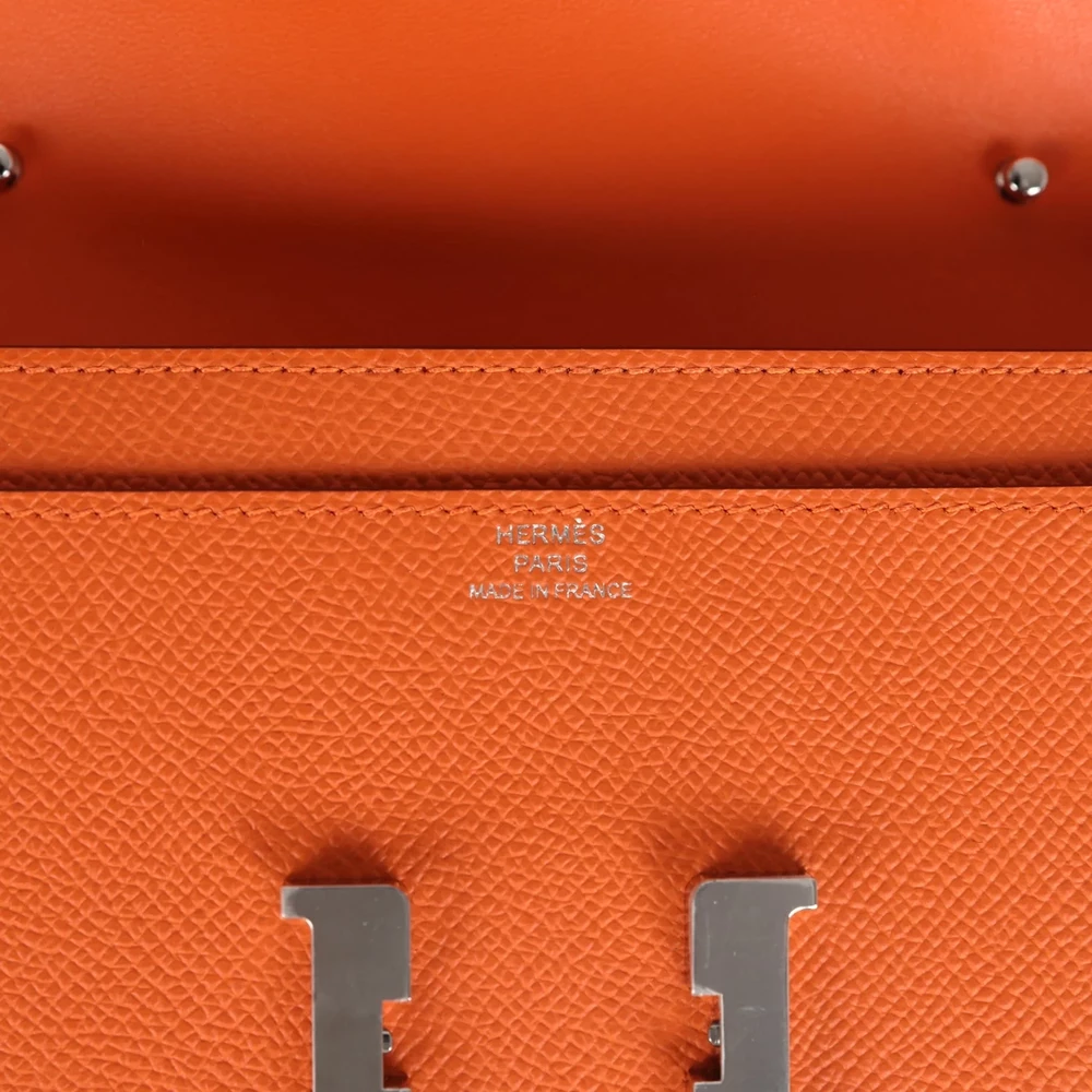 This Hermès Constance Wallet To Go in Orange is a vibrant and sophisticated expression of luxury. Crafted from Epsom leather, its smooth yet structured finish highlights the rich orange hue. The iconic “H” clasp in palladium hardware adds a touch of timeless elegance, while the crossbody strap ensures effortless versatility. Designed for both style and functionality, this wallet is a refined addition to any collection.