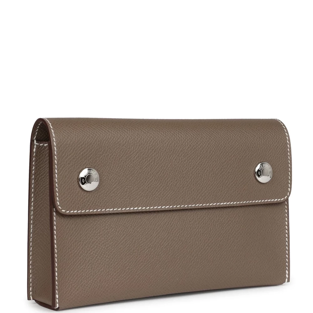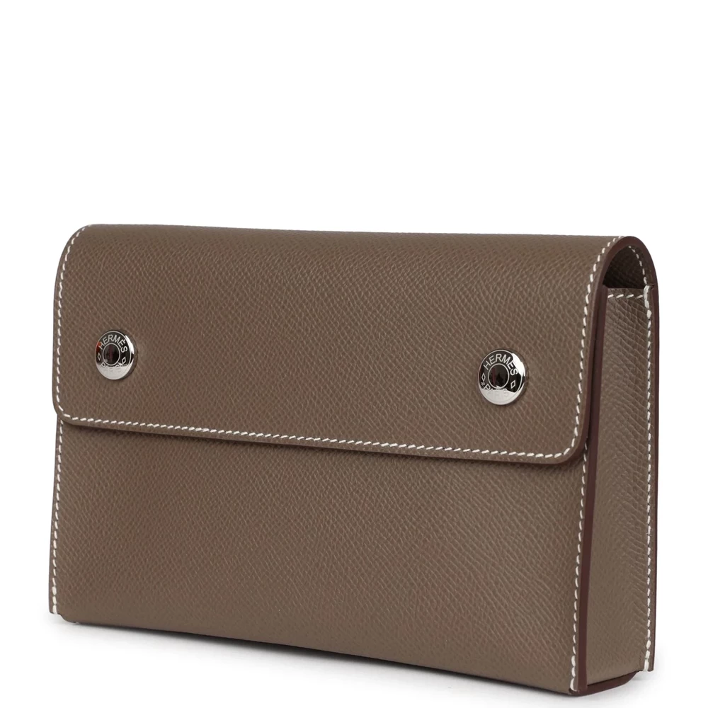This Hermès Wallet in Etoupe Epsom leather is a sleek and versatile piece designed for everyday use. The structured Epsom leather ensures a scratch-resistant surface, while the Etoupe shade adds a timeless charm. Featuring a simple yet functional snap closure, it securely holds essentials in a compact format. The palladium hardware offers a modern contrast, enhancing its understated elegance. A refined addition to any collection, this wallet is a perfect balance of style and practicality.