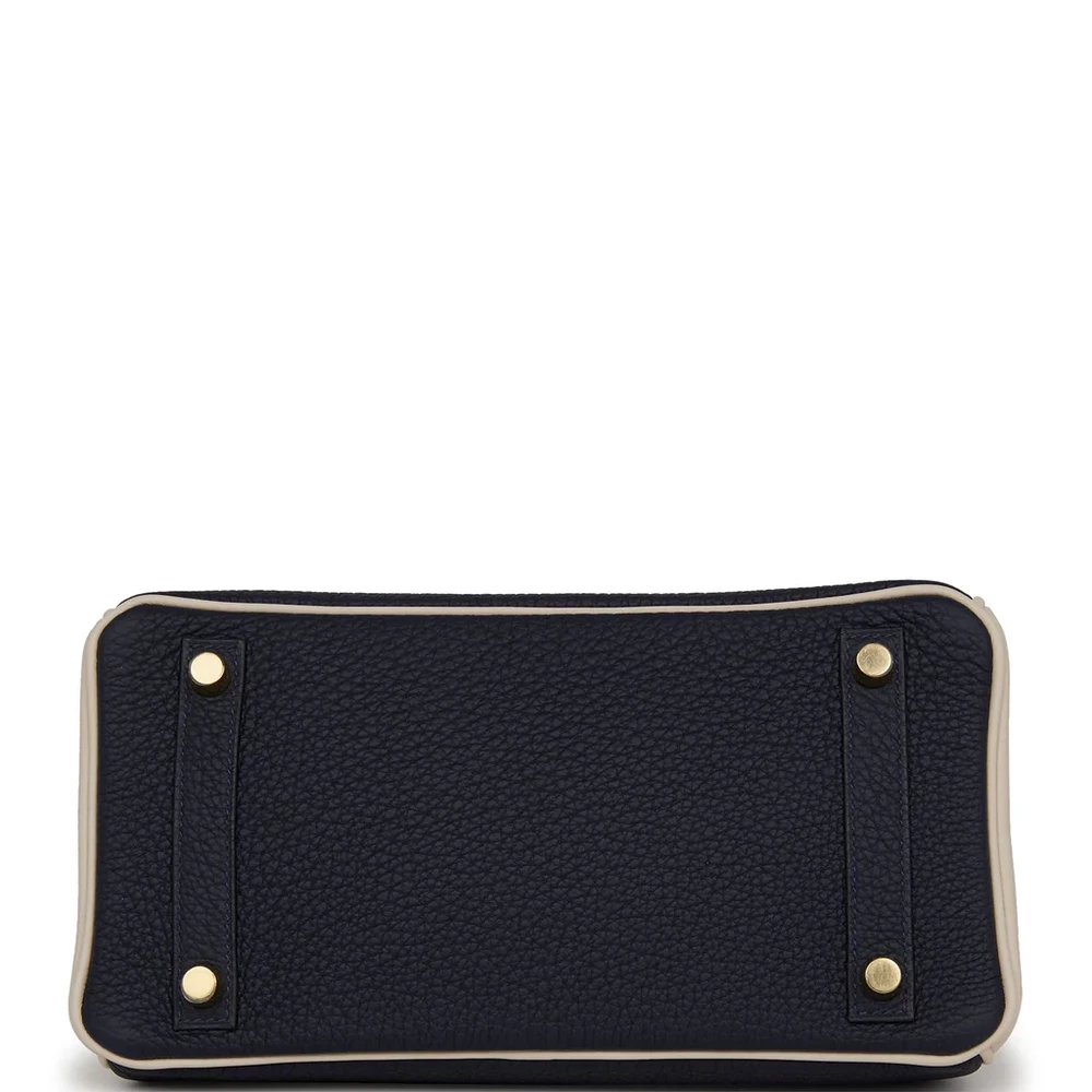 This Hermès Special Order Birkin is fashioned from Bleu Nuit and Craie Togo leather with gold hardware, featuring tonal stitching, a front flap with two straps and a center toggle closure, a clochette with lock and two keys, and double rolled handles. The interior is lined with Craie chèvre leather and includes one zip pocket with an Hermès-engraved zipper pull and an open pocket on the opposite side.