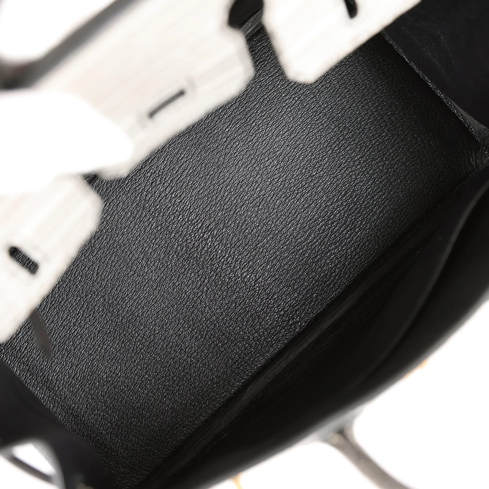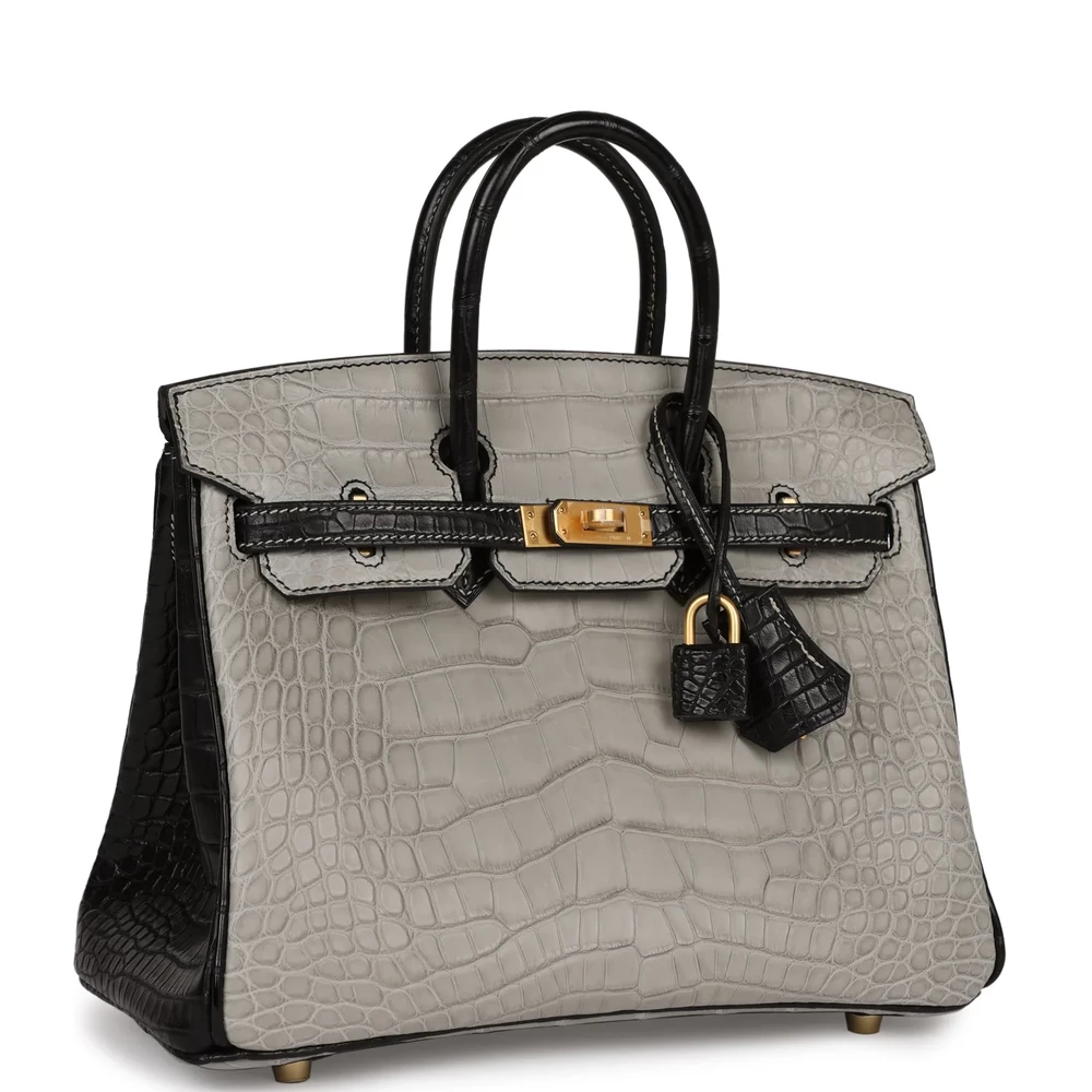 This Hermès Birkin 25 is designed in Gris Perle and Black matte alligator Mississippiensis leather, featuring brushed gold hardware, contrast stitching, a front strap with two straps and a center toggle closure, a clochette with lock and two keys, and double rolled handles. The interior is lined with Black chèvre leather and includes one zip pocket with an Hermès engraved zipper pull and an open pocket on the opposite side. The matte alligator leather adds a sleek, luxurious touch to the design. The combination of Gris Perle and Black creates a timeless, versatile look. The spacious interior ensures you have enough room for your essentials.
