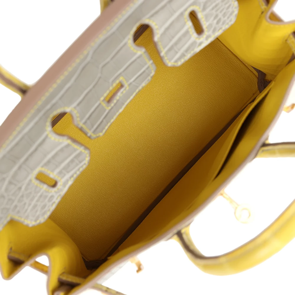 This Hermès special-order Birkin 25 is crafted from Gris Perle and Mimosa matte Mississippienis alligator leather with brushed gold hardware, featuring contrast stitching, a front strap, two straps with a center toggle closure, a clochette with lock and two keys, and double rolled handles. The interior is lined with Mimosa chèvre leather and includes one zip pocket with an Hermès engraved zipper pull and an open pocket on the opposite side. The matte alligator leather provides a unique texture, while the brushed gold hardware adds a sophisticated touch. The Mimosa interior adds a vibrant pop of color, making this Birkin truly one-of-a-kind.