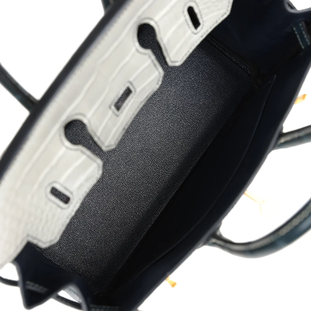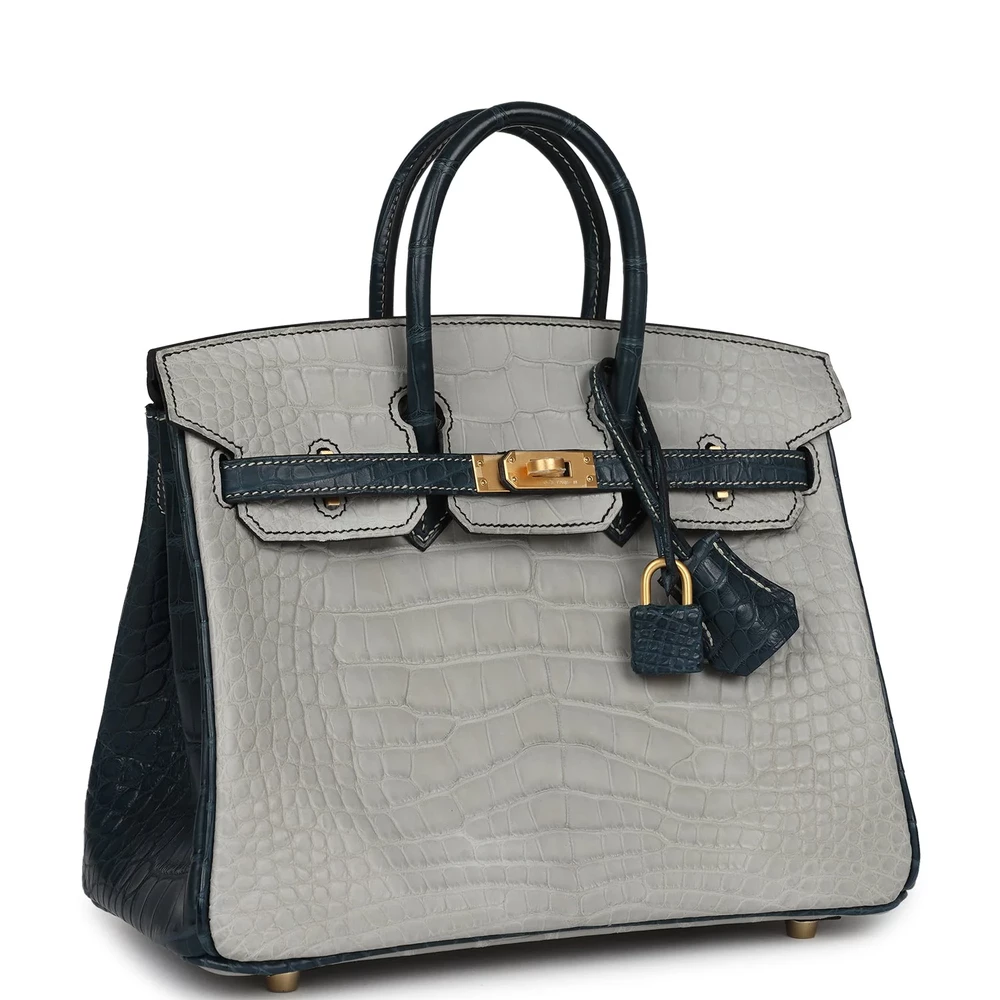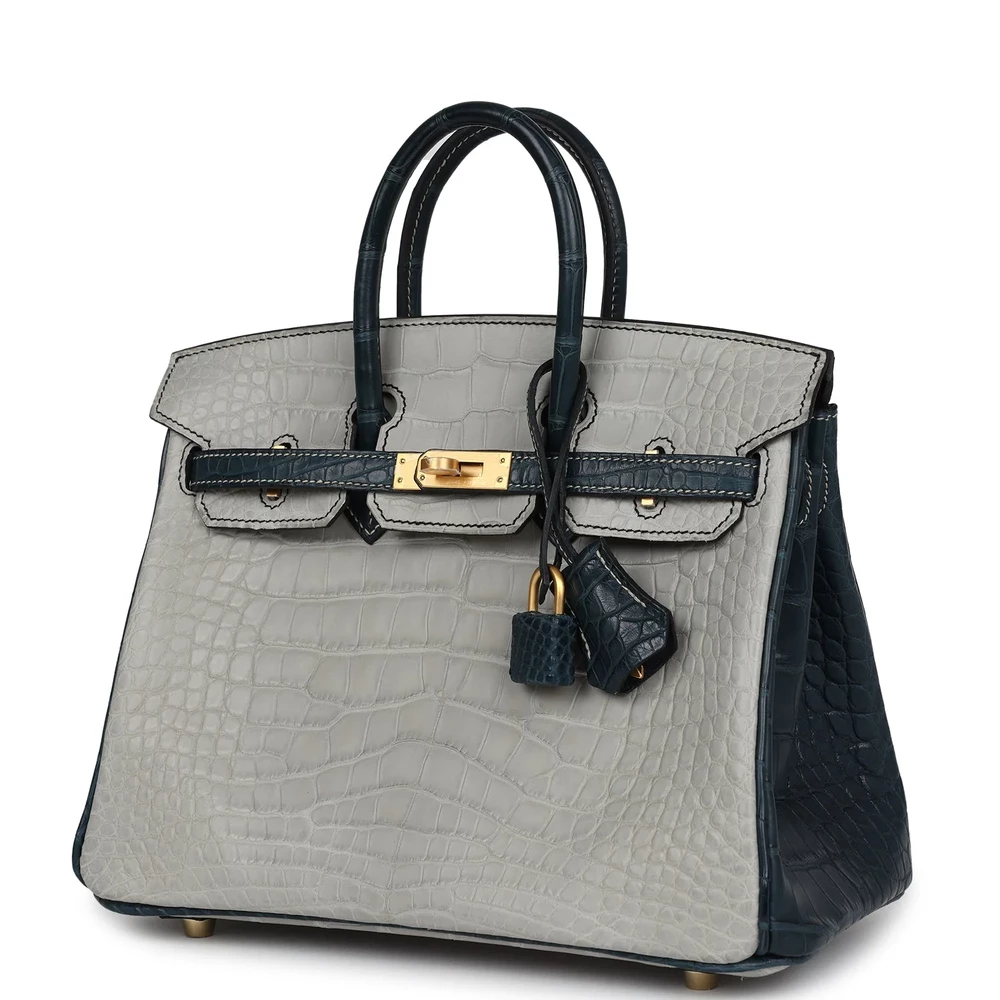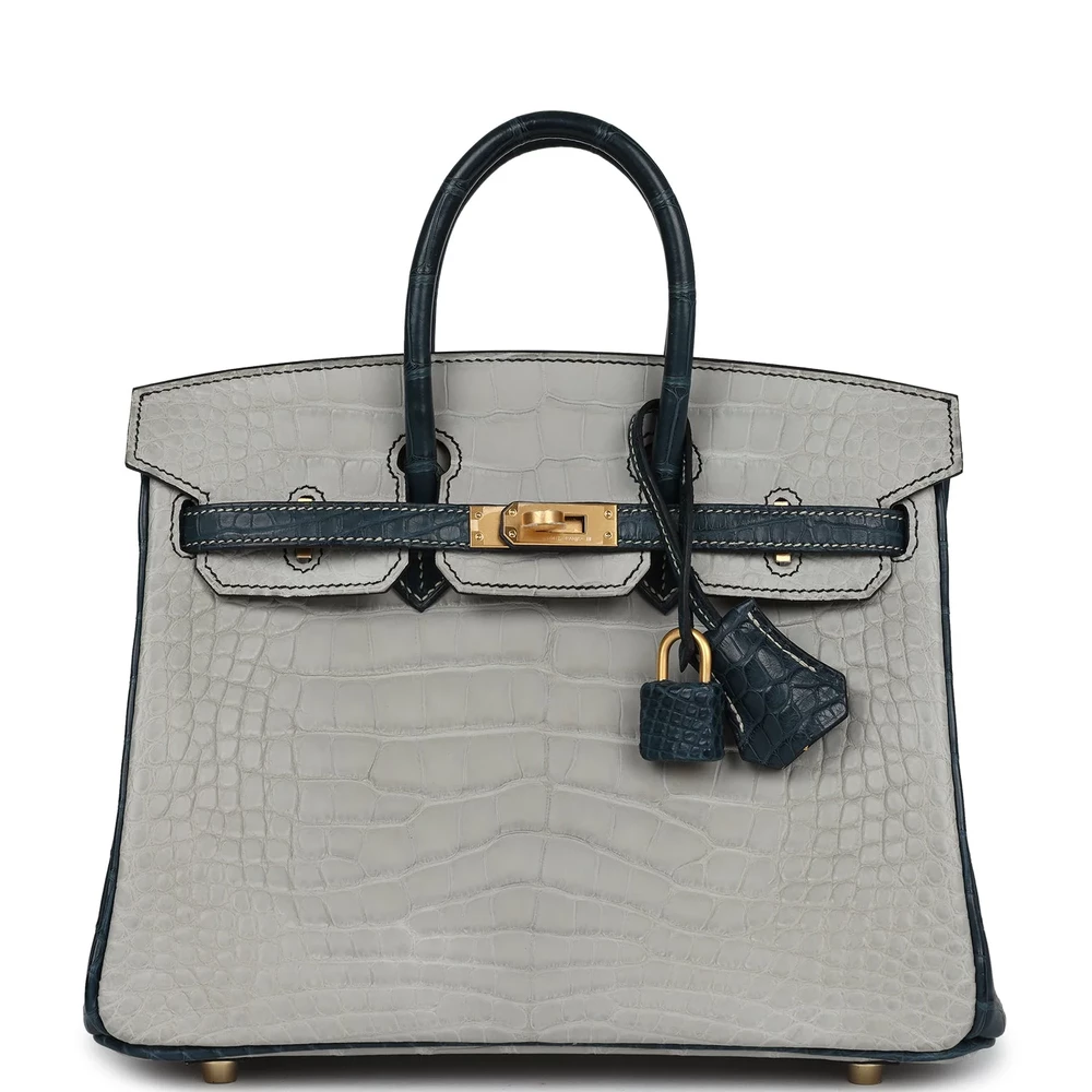 This Hermès special-order Birkin 25 is made from Gris Perle and Vert Rousseau matte alligator leather, featuring brushed gold hardware, contrast stitching, a front flap with two straps and a center toggle closure, a clochette with lock and two keys, and double rolled handles. The interior is lined with Vert Rousseau chèvre leather and offers one zip pocket with an Hermès engraved zipper pull and an open pocket on the opposite side. The combination of Gris Perle and Vert Rousseau offers a striking contrast. The brushed gold hardware enhances the overall elegance of the design. The alligator leather adds texture and durability to this luxurious piece.