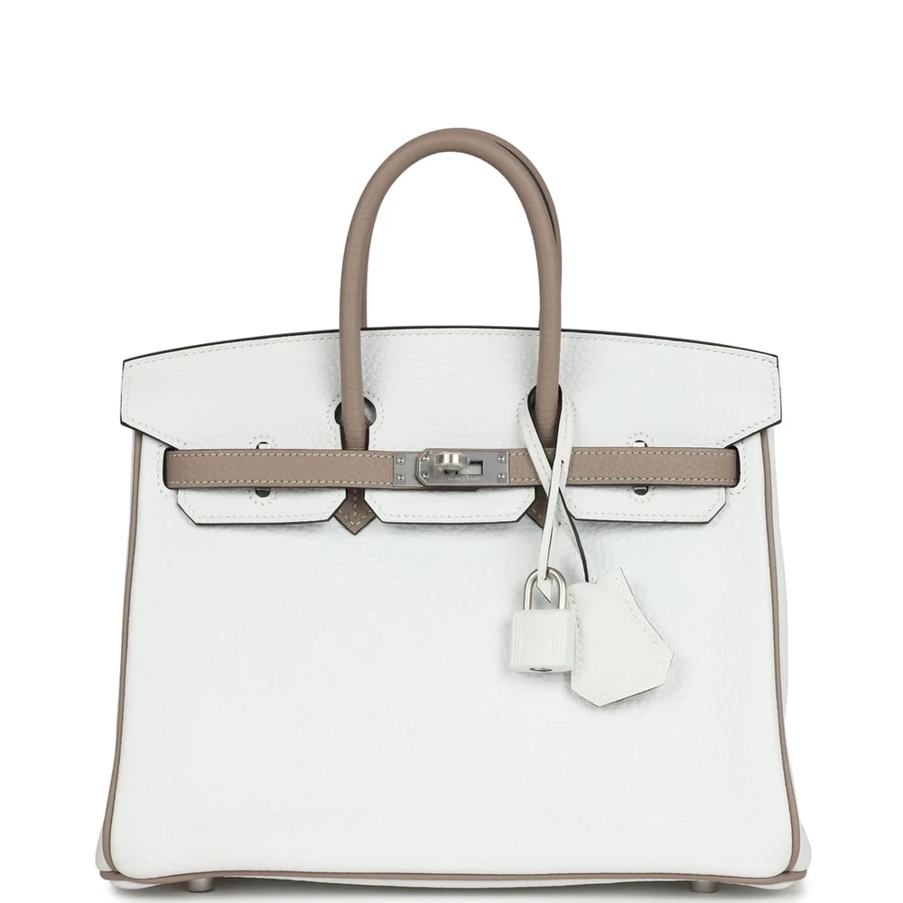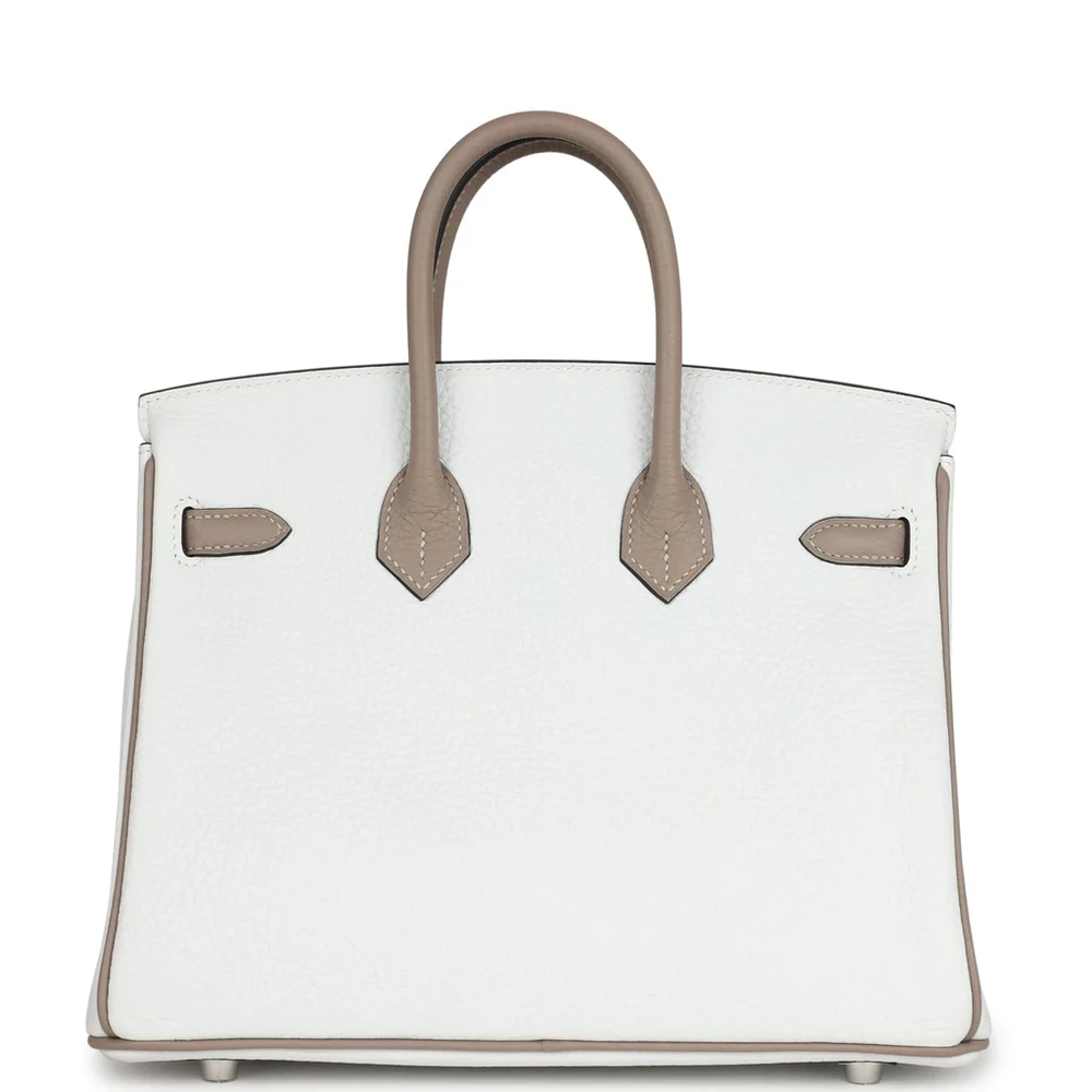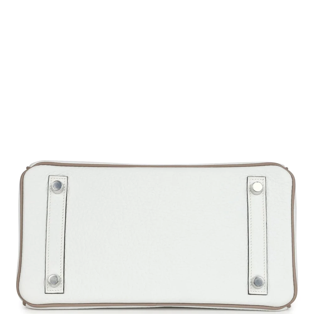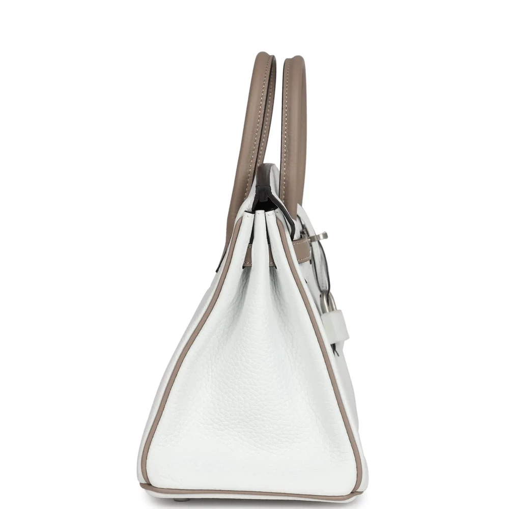 This Hermès Special Order Bi-color Birkin is made of White and Etoupe Clemence leather, paired with brushed palladium hardware. The bag showcases tonal stitching, a front flap with two straps, and a center toggle closure. It also includes a clochette with a lock and two keys, along with double rolled handles for comfortable carrying. The interior is lined with Etoupe Chevre leather, offering one zip pocket with an Hermès engraved zipper pull and an open pocket on the opposite side for easy storage.