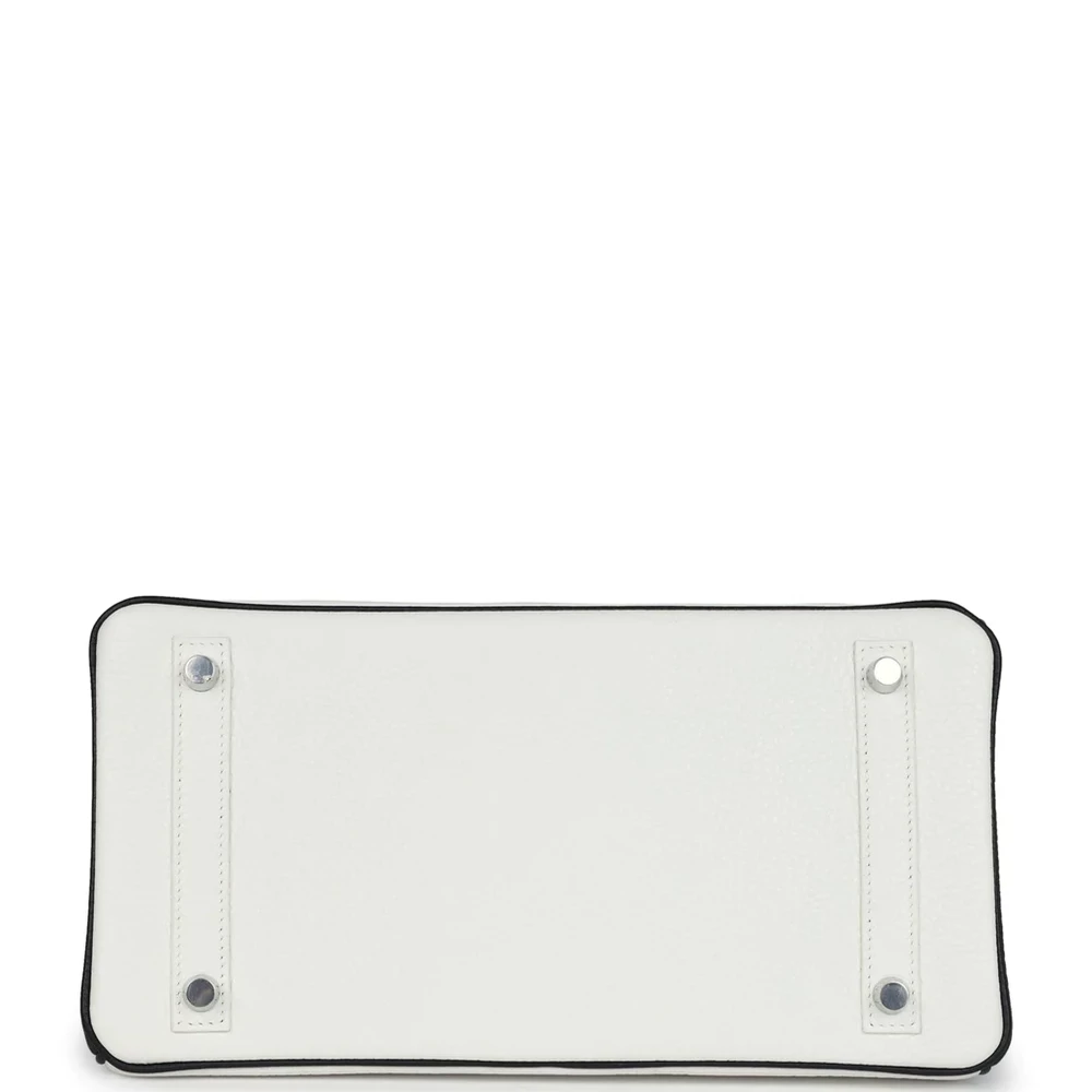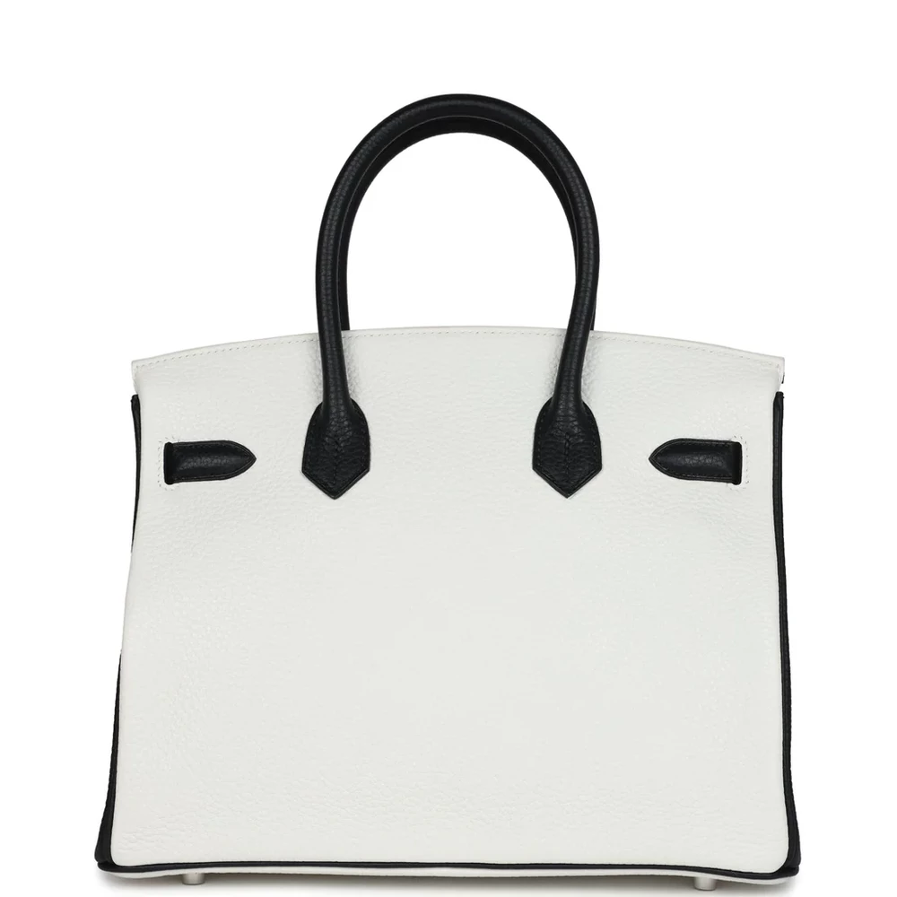 This Hermès Special Order Birkin is crafted from White and Black Clemence leather with brushed palladium hardware. The bag is designed with contrast stitching and a front flap, along with two straps and a center toggle closure. It includes a clochette with a lock and two keys, plus double rolled handles for a comfortable grip. The interior is lined with Black Chevre leather and features one zip pocket with an Hermès engraved zipper pull and an open pocket on the opposite side for convenient storage.