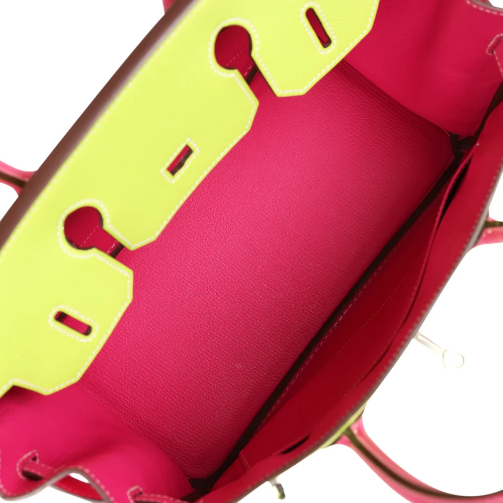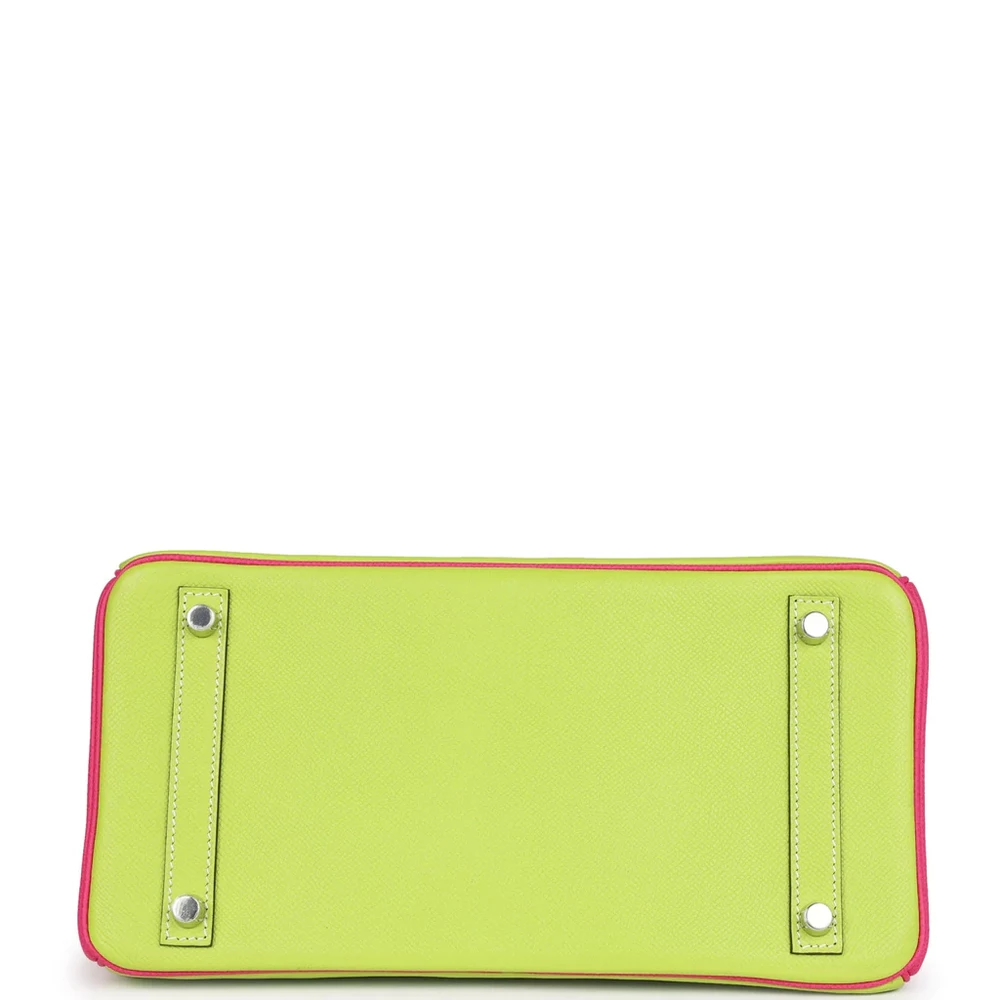 This Hermès Special Order Birkin is crafted from Kiwi and Rose Tyrien Epsom leather with palladium hardware, featuring tonal stitching, a front flap with two straps and a center toggle closure, a clochette with lock and two keys, and double rolled handles. The interior is lined with Rose Tyrien chèvre leather and includes one zip pocket with an Hermès-engraved zipper pull and an open pocket on the opposite side.