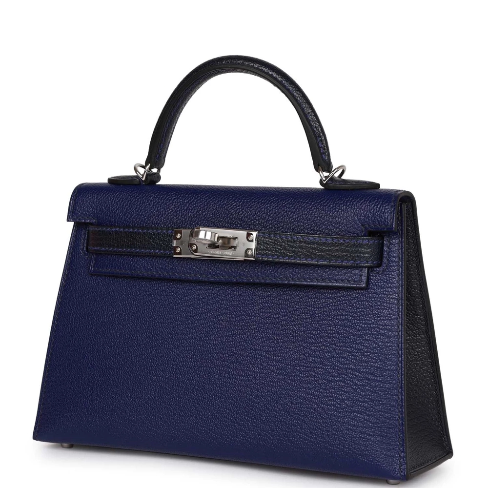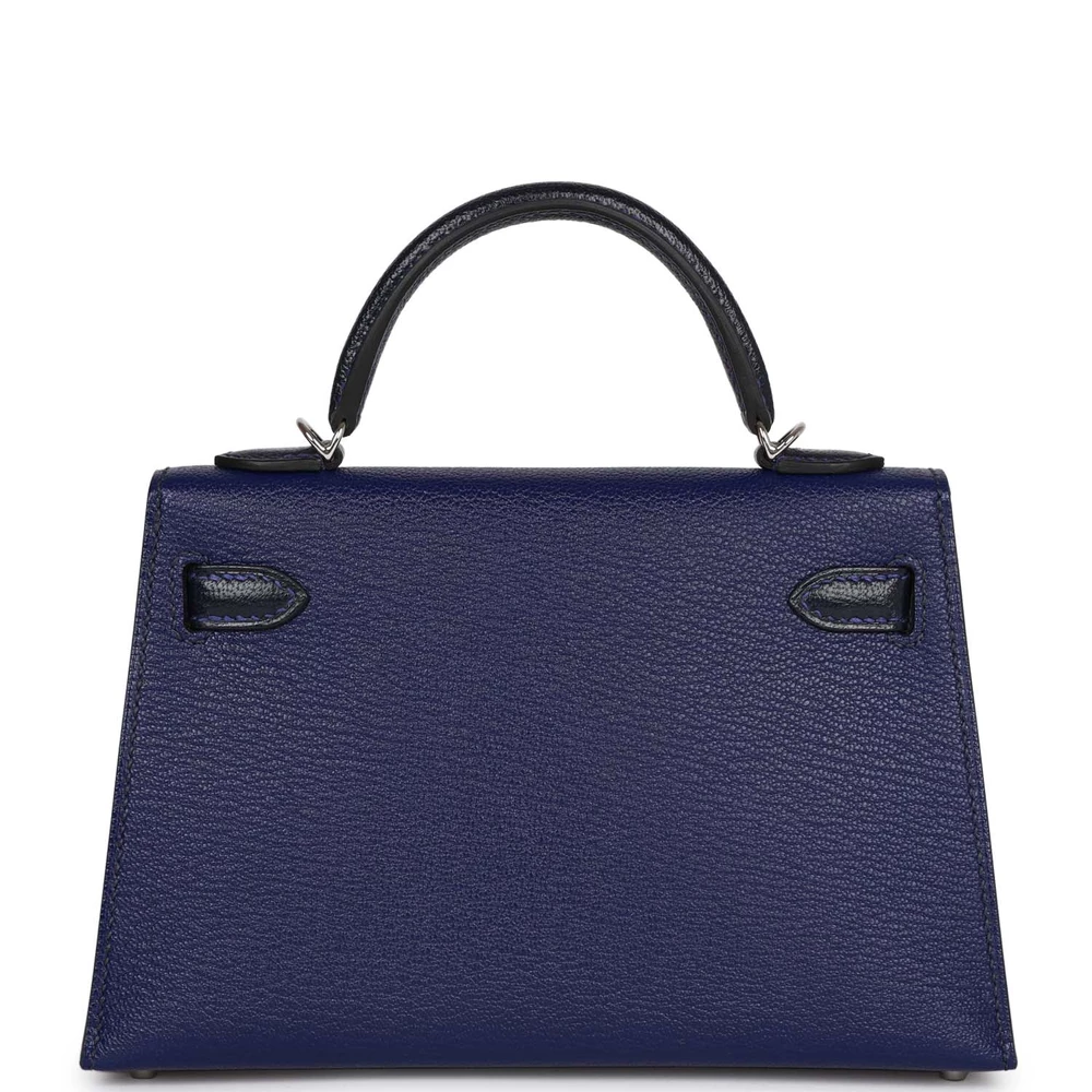 This Hermès Special Order Kelly Sellier 20 in Bleu Encre and Bleu Indigo is a rare and exquisite masterpiece. Crafted from supple Chevre Mysore leather, it features a unique two-tone design. The Palladium hardware adds a modern touch. Its deep blue hues are perfect for making a bold statement. The structured silhouette ensures timeless sophistication. A must-have for collectors. This bag is a true Hermès treasure.
