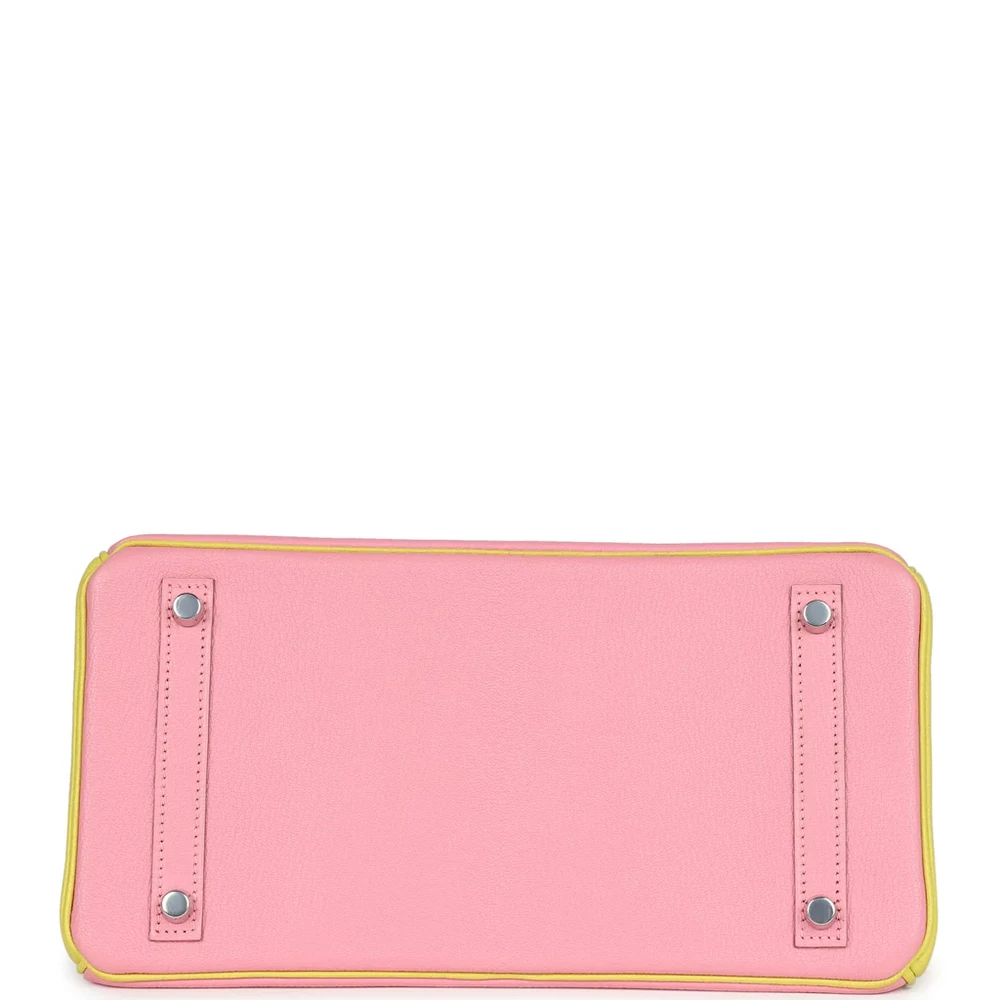 This Hermès Special Order Birkin is made from Rose Confetti and Lime Chevre Mysore leather with palladium hardware, offering a playful and elegant design. The bag features tonal stitching, a front flap with two straps, and a front toggle closure for added security. A clochette with a lock and two keys enhances the bag’s sophistication, while the double rolled handles ensure comfort during carrying. The interior is lined with Lime Chevre leather, providing a smooth and premium finish. It includes one zip pocket with an Hermès engraved zipper pull and an open pocket on the opposite side for easy access.