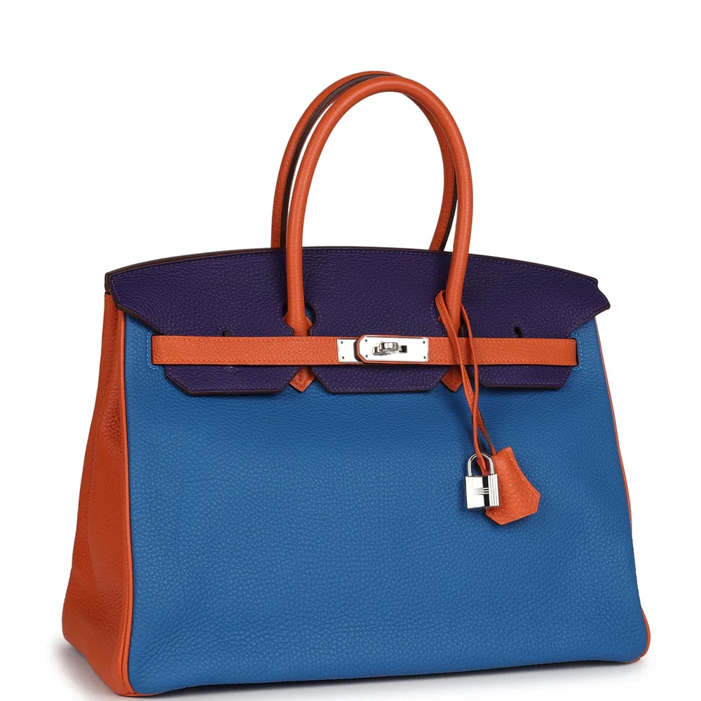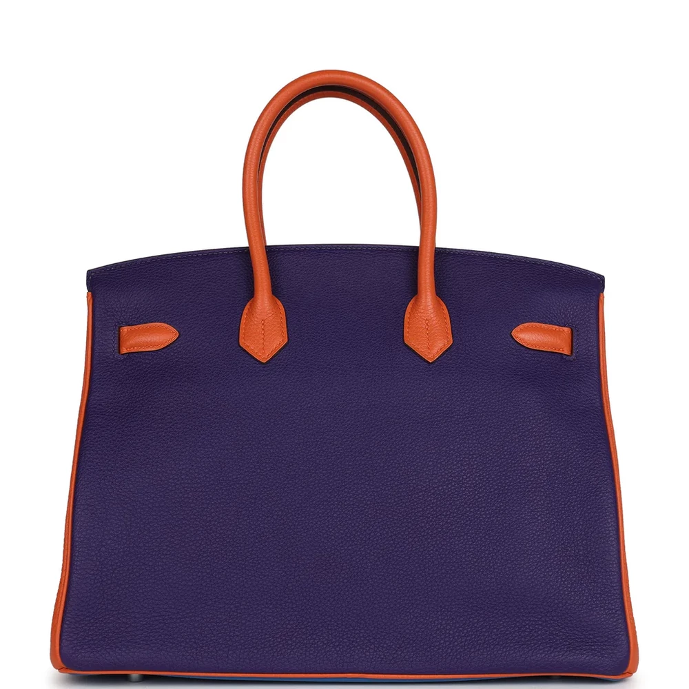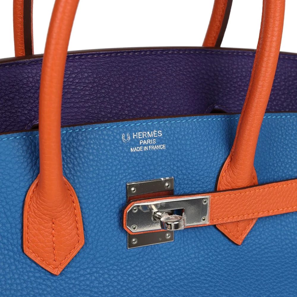This Hermès Special Order Birkin is crafted from a tricolor combination of Bleu Hydra, Ultraviolet, and Orange Togo leather with palladium hardware. It features tonal stitching, a front flap with two straps and a center toggle closure, a clochette with lock and two keys, and double rolled handles. The interior is lined with matching chèvre leather and includes one zip pocket with an Hermès-engraved zipper pull and an open pocket on the opposite side.