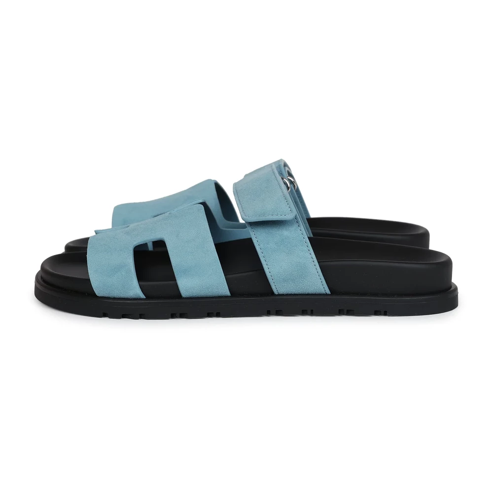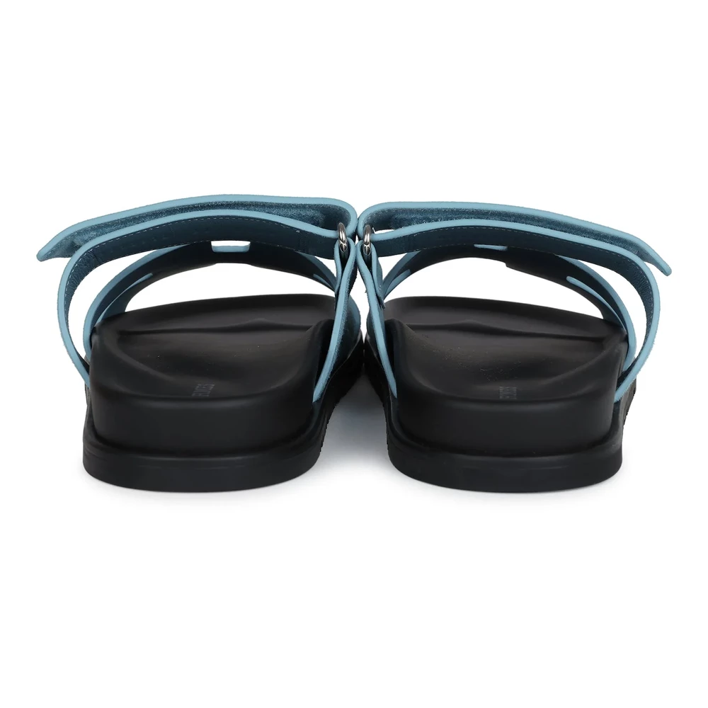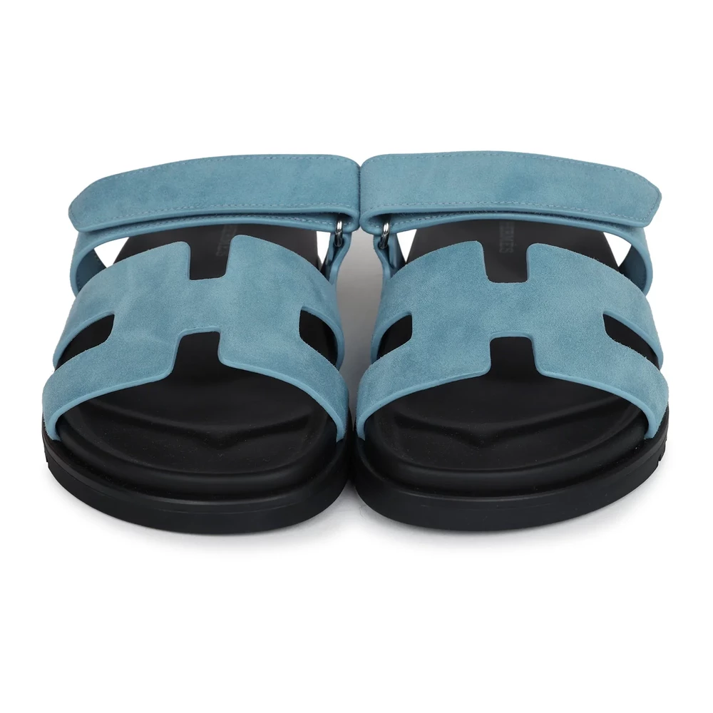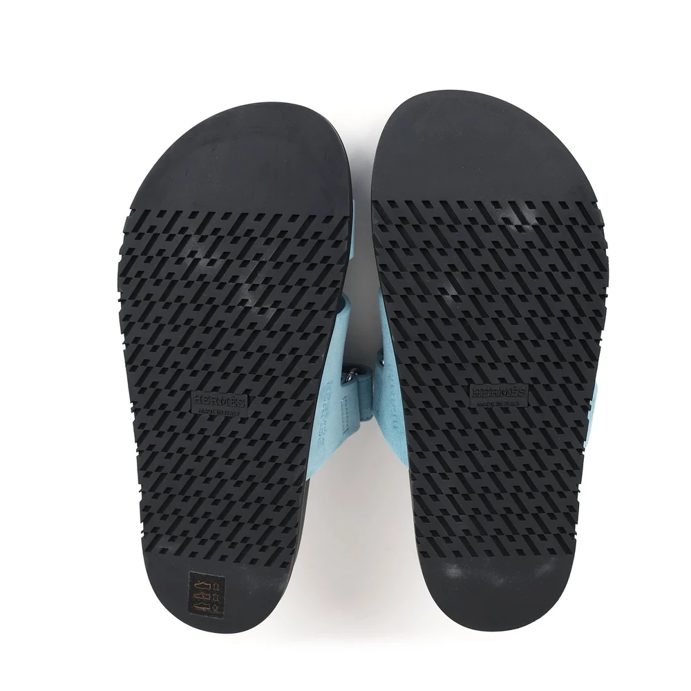 This Hermès Chypre Techno sandal in Bleu Mineral suede with palladium hardware is a modern and luxurious footwear choice. The cool-toned blue suede adds a soft and refined look, while the adjustable strap with palladium hardware ensures a secure fit. The ergonomic sole provides ultimate comfort, making this sandal perfect for everyday wear with a stylish edge.