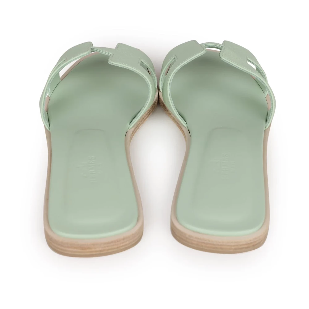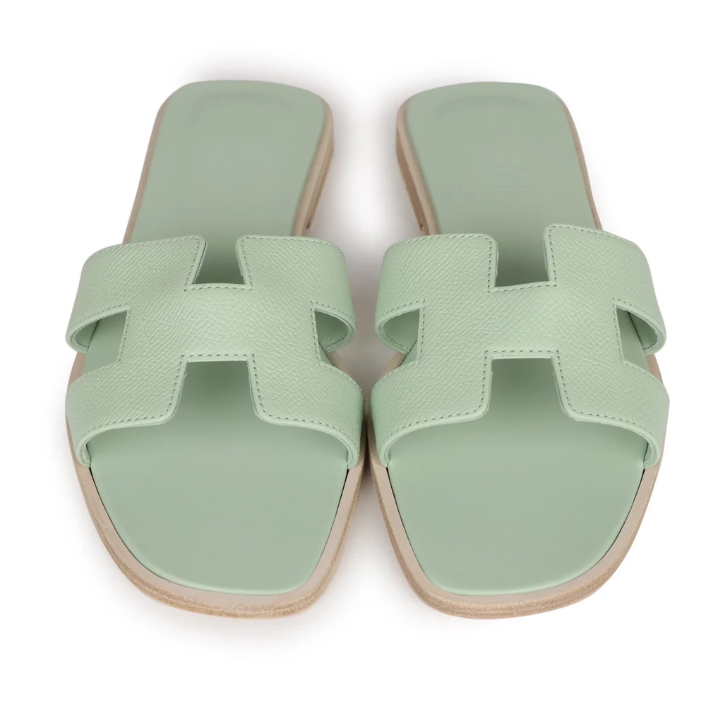 This Hermès Oran sandal in Vert Jade Epsom leather is a refreshing and elegant choice. The structured Epsom leather in a vibrant jade green hue adds a polished touch to the timeless design. The flat sole ensures comfort, making this sandal a sophisticated addition to any collection, perfect for both casual and refined styling.