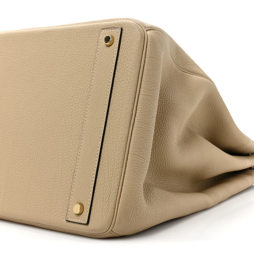 This Hermès Togo HAC Birkin 40 in Trench is a sophisticated and structured handbag in a timeless beige hue. The Togo leather provides durability while maintaining a slightly structured shape. The HAC (Haut à Courroies) design features a taller silhouette, offering extra space while retaining the iconic Birkin aesthetic. Palladium hardware complements the Trench color beautifully. This is a refined and versatile piece for those who appreciate classic neutrals.