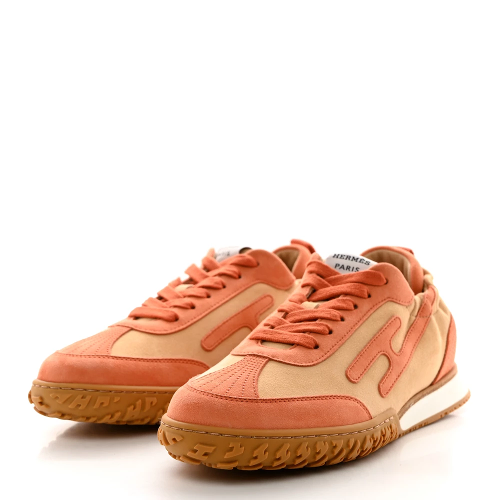 This Hermès Jet sneaker in Beige Natura and Orange Nacarat Suede & Goatskin is a sporty yet refined footwear choice. The combination of neutral and bold tones enhances its dynamic appeal, while the suede texture adds depth. Designed with a cushioned sole for comfort, it blends function with high-end craftsmanship. Whether styled with athleisure or casual ensembles, this sneaker offers a modern edge.