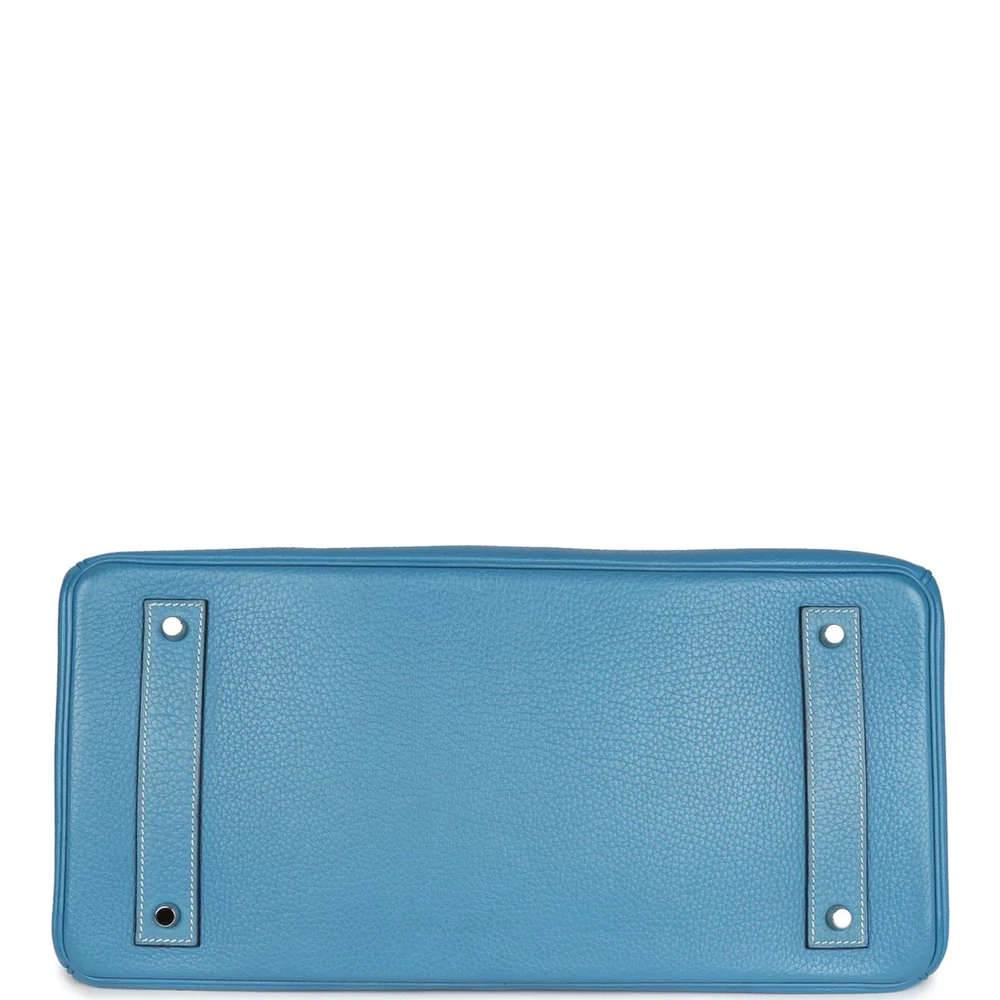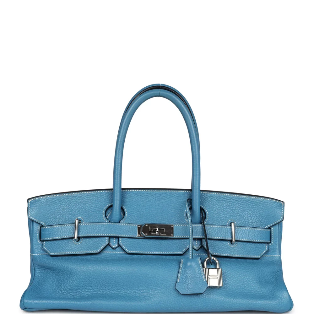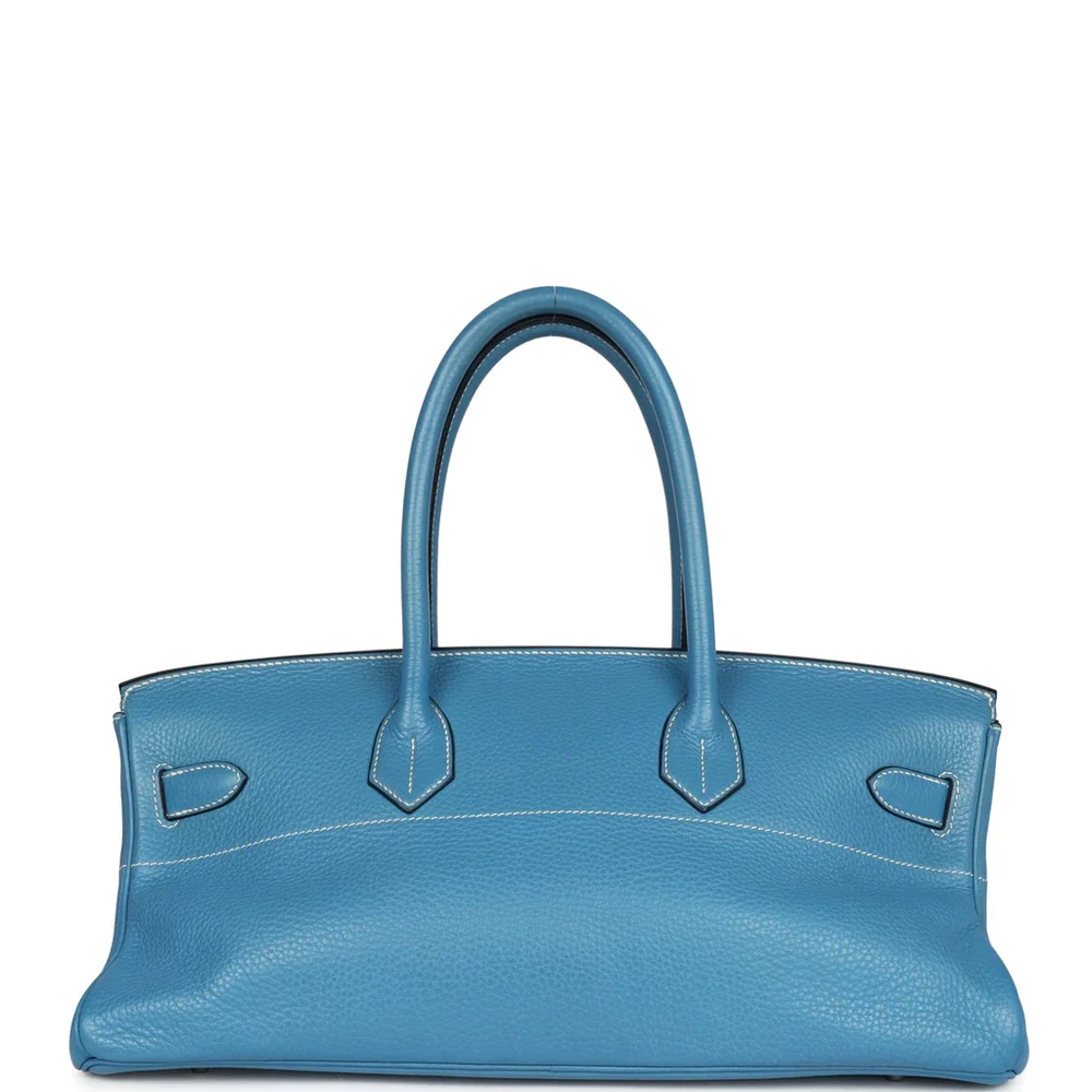 This Special Edition Shoulder Birkin, designed by Jean-Paul Gaultier, is made from Blue Jean Clemence leather with palladium hardware, showcasing contrast stitching, two straps with a front toggle closure, a clochette with lock and two keys, and double rolled handles. The interior is lined with Blue Jean chèvre leather and does not have additional inside pockets.