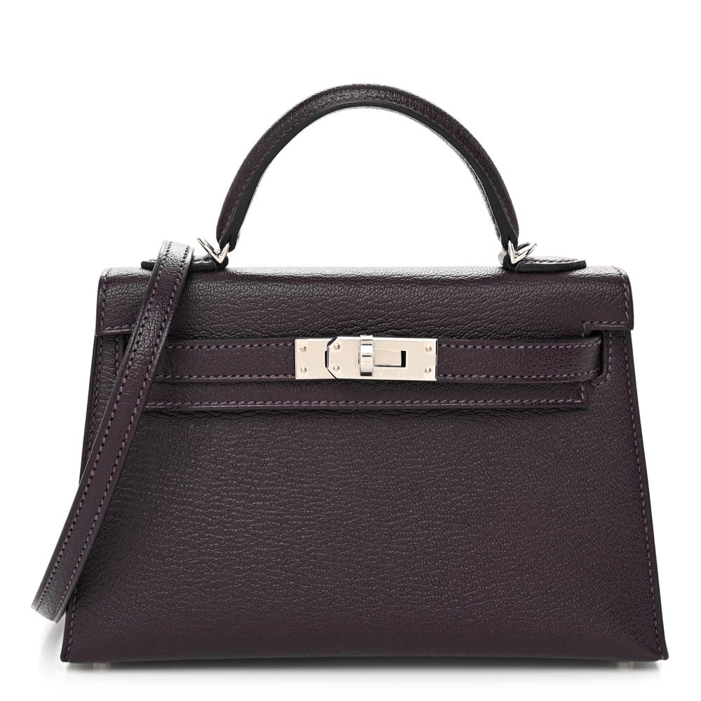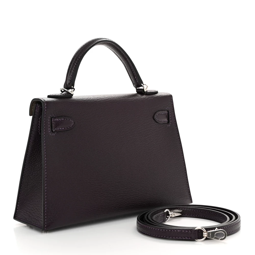 This Hermès Chèvre Mysore Verso Mini Kelly Sellier 20 Raisin Origan is a rare and charming handbag with an exquisite color contrast. The Chèvre Mysore leather provides a fine grain and natural sheen, enhancing its luxurious appeal. The deep Raisin exterior paired with the Origan interior creates a striking dual-tone effect. Gold hardware adds a warm touch, complementing the rich hues beautifully. This Mini Kelly is perfect for those who appreciate rare and playful color combinations.