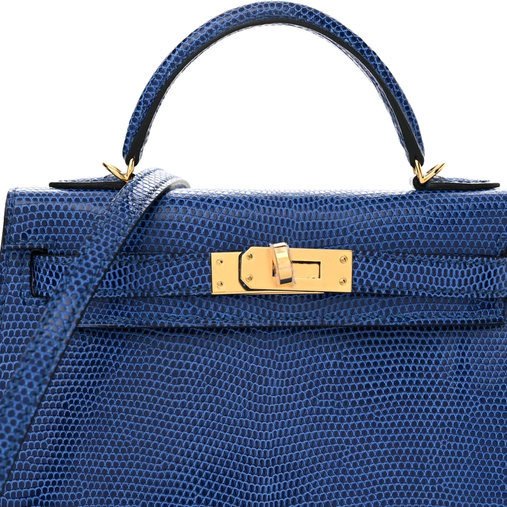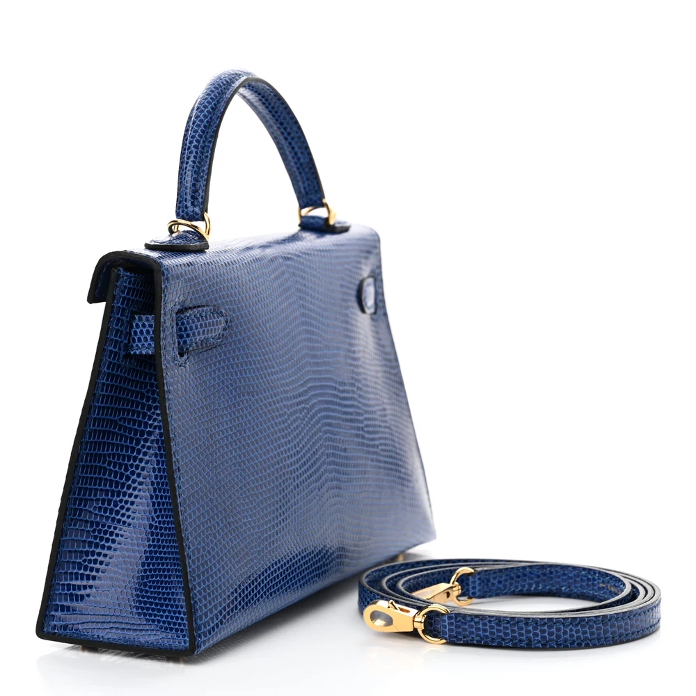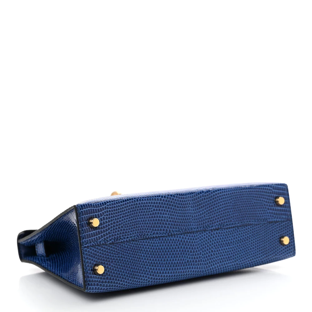 This Hermès Shiny Lizard Mini Kelly Sellier 20 Bleu Saphir is an exquisite and rare handbag in a deep sapphire blue shade. The lizard leather provides a glossy, luxurious finish, highlighting its exotic appeal. The compact 20 cm size makes it a dazzling piece for evening wear. Palladium hardware adds a cool contrast, enhancing its rich color. This Mini Kelly is a collector’s masterpiece for those who love rare and opulent materials.