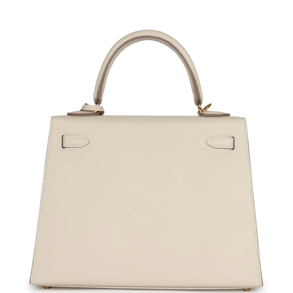This Hermès Kelly Sellier 25 is constructed from Craie Epsom leather with gold hardware. It features tonal stitching, a front flap with two straps and a toggle closure, a clochette with lock and two keys, a single rolled handle, and a removable shoulder strap. The interior is lined with Craie chèvre leather and includes one open pocket on the back wall. The elegant Craie leather and gold hardware create a timeless, sophisticated look. The 25 cm size is ideal for those seeking a compact, stylish bag. The removable shoulder strap adds convenience and versatility.
