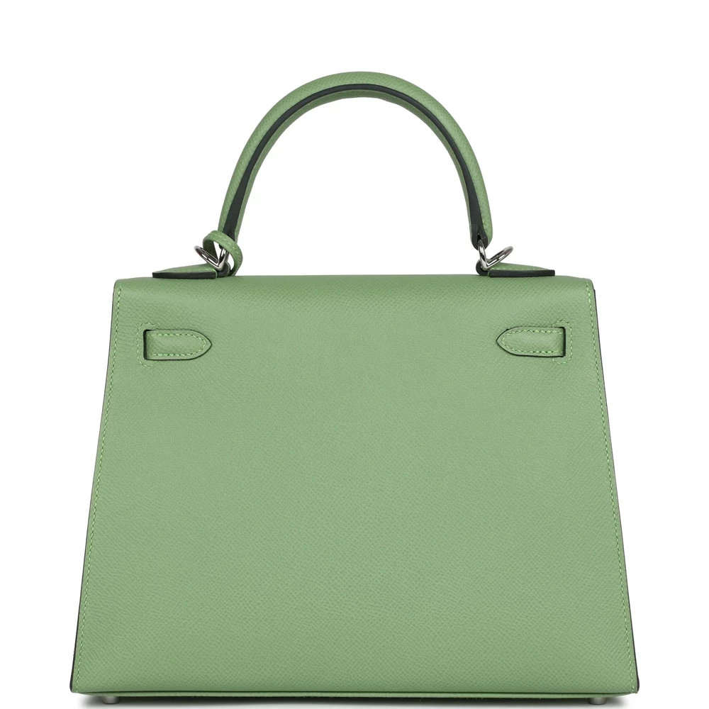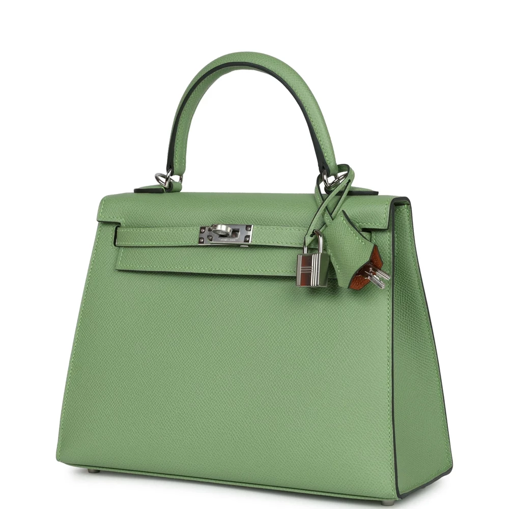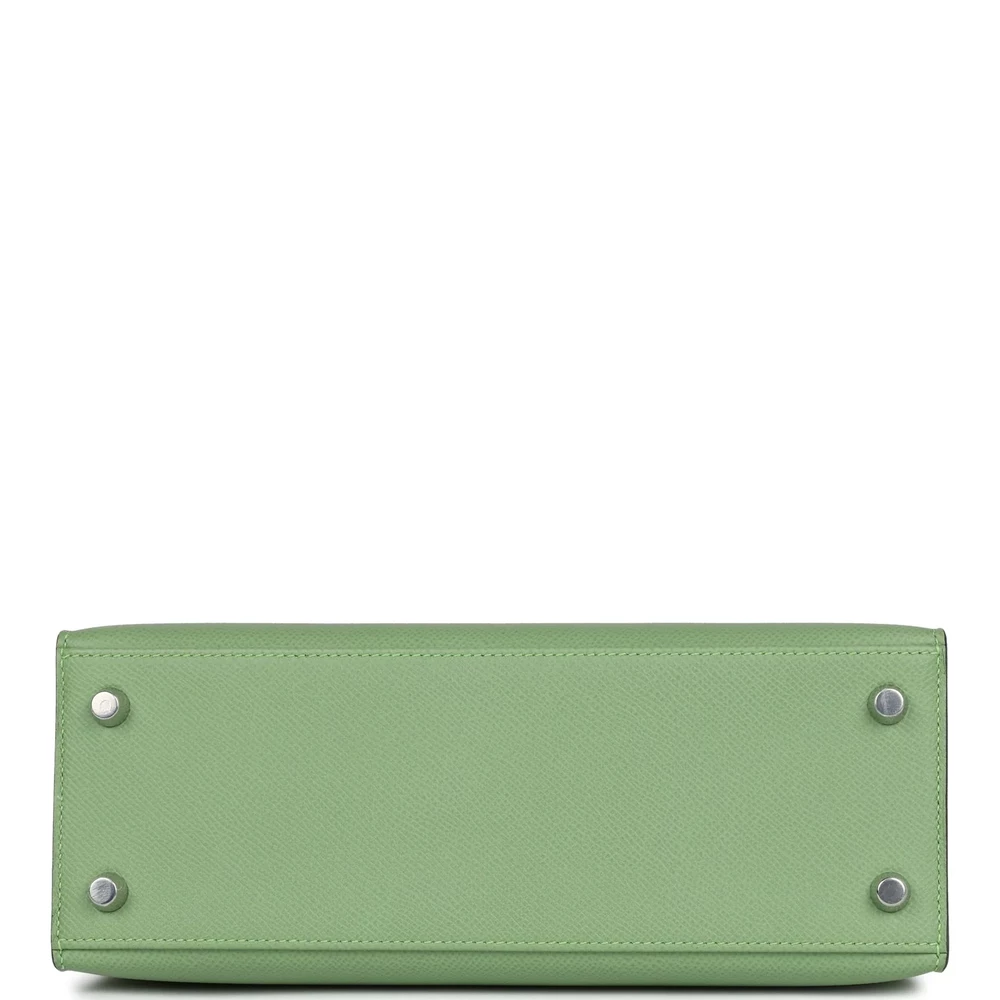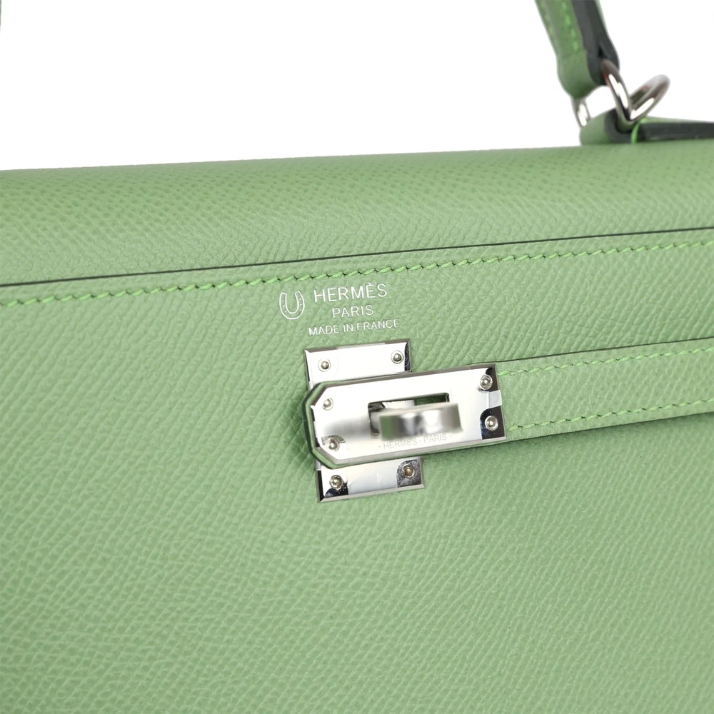 This Hermès Special Order Kelly Sellier 25 in Vert Criquet is a rare and luxurious masterpiece. Made from durable Epsom leather, it features a unique Verso design. The Palladium hardware adds a modern touch. Its vibrant green hue is perfect for making a bold statement. The structured silhouette ensures timeless elegance. A must-have for collectors. This bag is a true Hermès treasure.