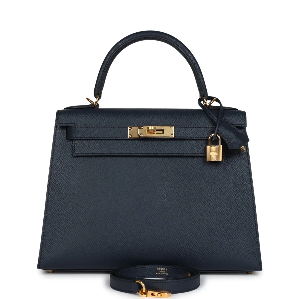 This Hermès Kelly Sellier 28 in Bleu Indigo is a luxurious and sophisticated choice. Made from durable Epsom leather, it features a structured silhouette. The Gold hardware adds a touch of opulence. Its deep blue hue is perfect for adding elegance to any outfit. The spacious interior offers practicality and style. A must-have for any Hermès enthusiast. This bag is a true investment piece.