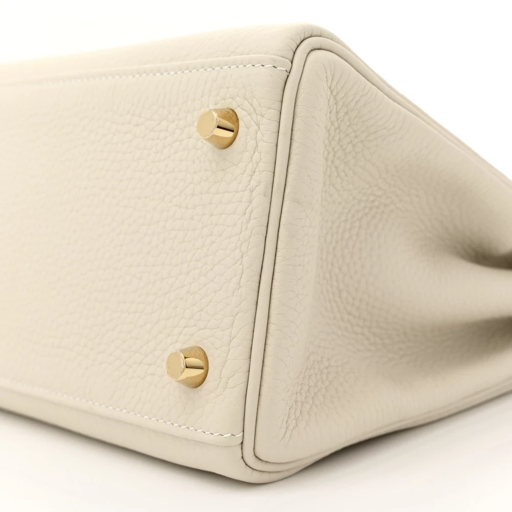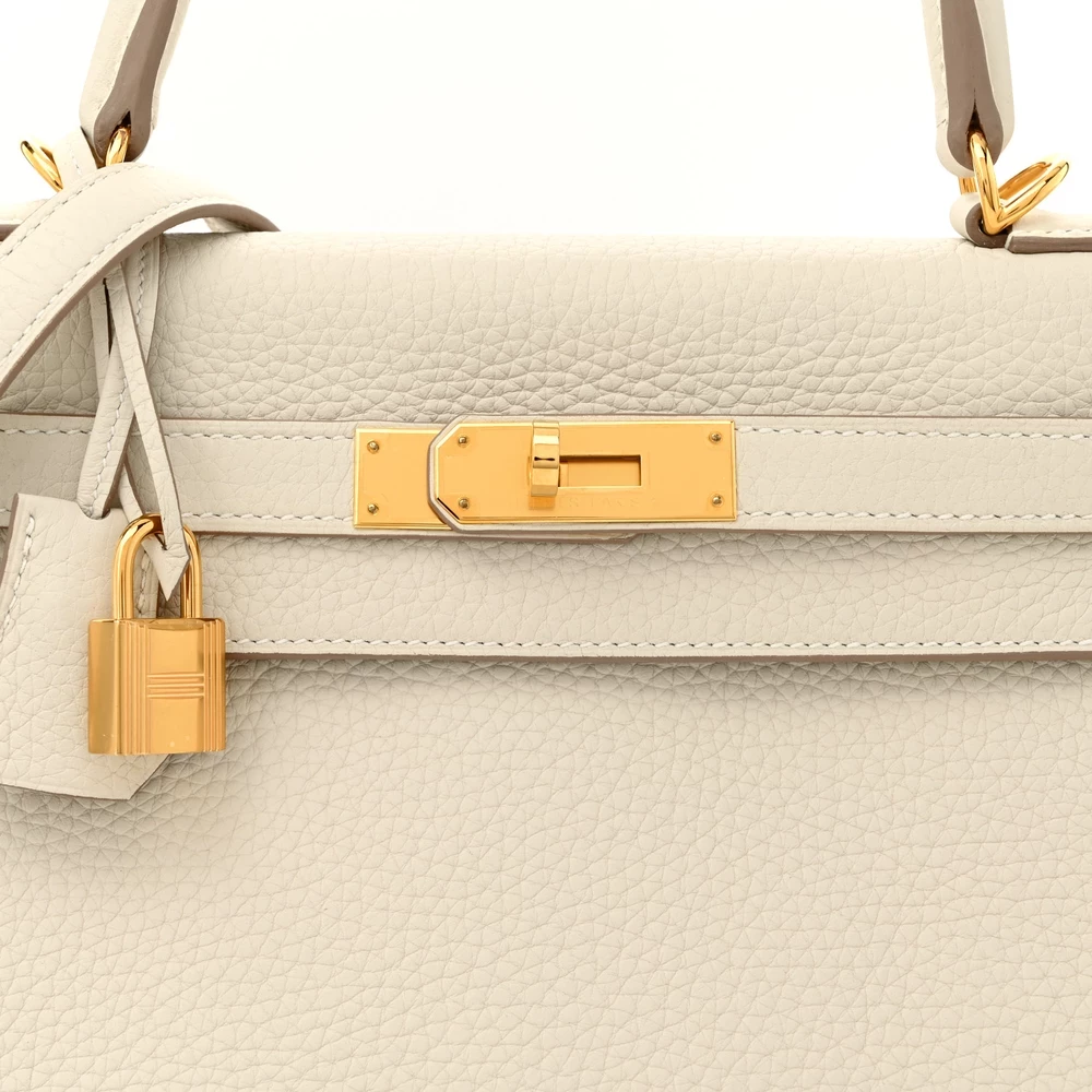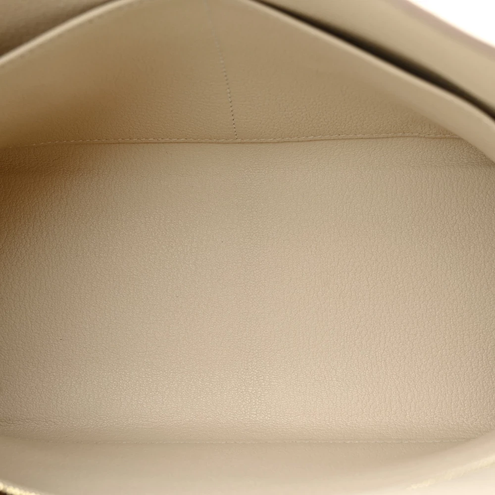 This Hermès Taurillon Clémence Kelly Retourne 28 Craie is a soft and relaxed handbag in a creamy off-white shade. The Taurillon Clémence leather provides a supple and slightly slouchy appearance, offering a more casual take on the classic Kelly. The 28 cm size makes it a practical choice for everyday wear. Palladium hardware adds a sleek contrast, enhancing its understated elegance. This Kelly is a perfect blend of sophistication and effortless charm.